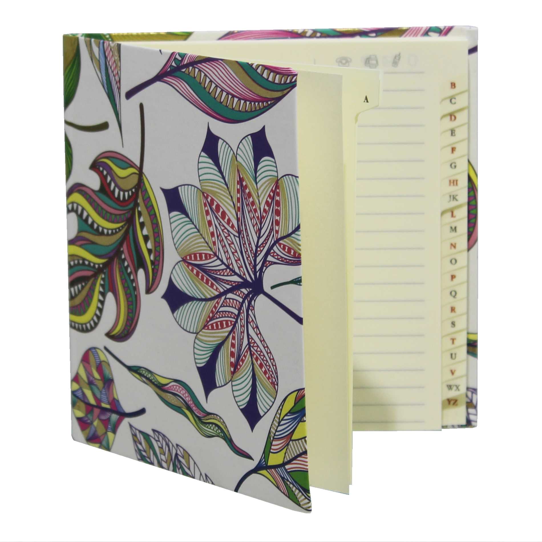 Das Adressbuch ist mit einem Cover aus leichtem, flexiblem Material gefertigt, so dass es angenehm in der Hand liegt. Der Papierbezug des Covers zeigt einen eleganten Druck mit farbenfroh gestalteten Blättern in verschiedenen Farben und Formen, die einen Hauch von Natürlichkeit und Raffinesse vermitteln.