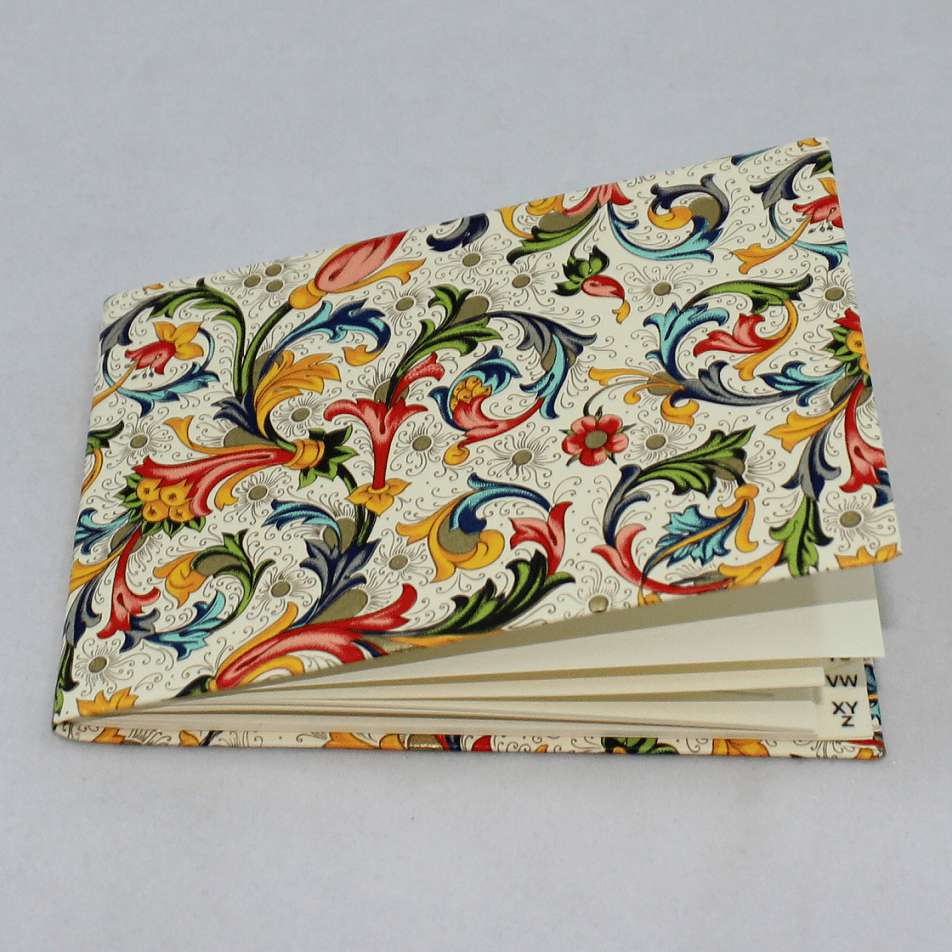 Das Adressbuch Florentina rot entsteht aus einem Papierbezug mit einem der ältesten floralen Druckmotive Italiens. Das farbenfrohe Blumenmuster ist mit Goldpulverakzenten geschmückt.