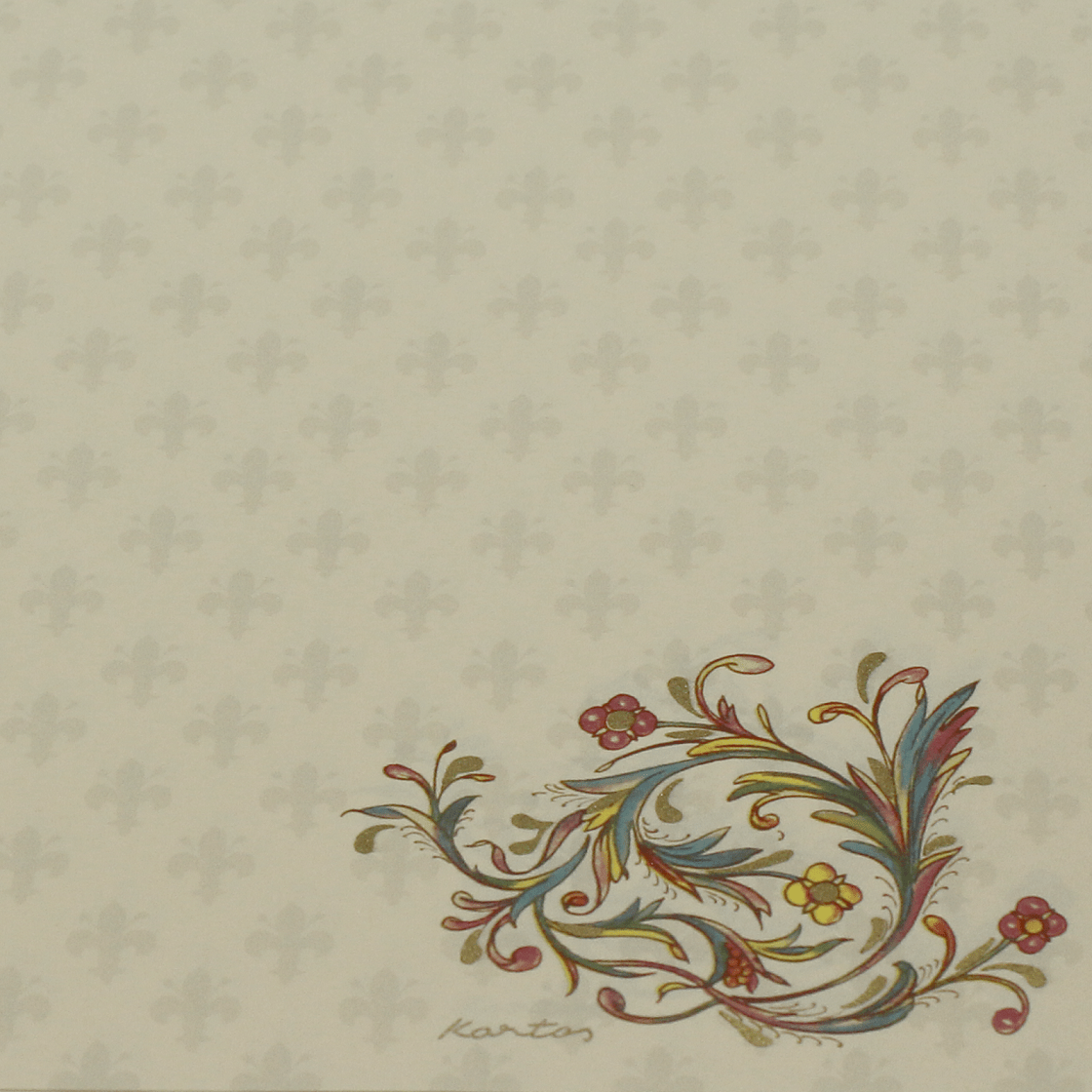 Von besonderer Qualität ist das echte Büttenpapier. Dieses ist absolut säurefrei im chamoirefarbenen Ton mit zarten Wasserzeichen im französichen Lilienmotiv „Fleur de Lis“ gehalten. Es ist besonders geeignet um auch mit Tinte beschrieben zu werden. Auf dem Briefpapier ist in der rechten unteren Ecke ein wunderschöner Farbdruck aus floralen Blumenranken im Contrada-Design aufgebracht. Typisch für diesen Druck ist eine zusätzliche Goldpulverung, die diesem Motiv eine besondere Eleganz und Tiefe verleiht.