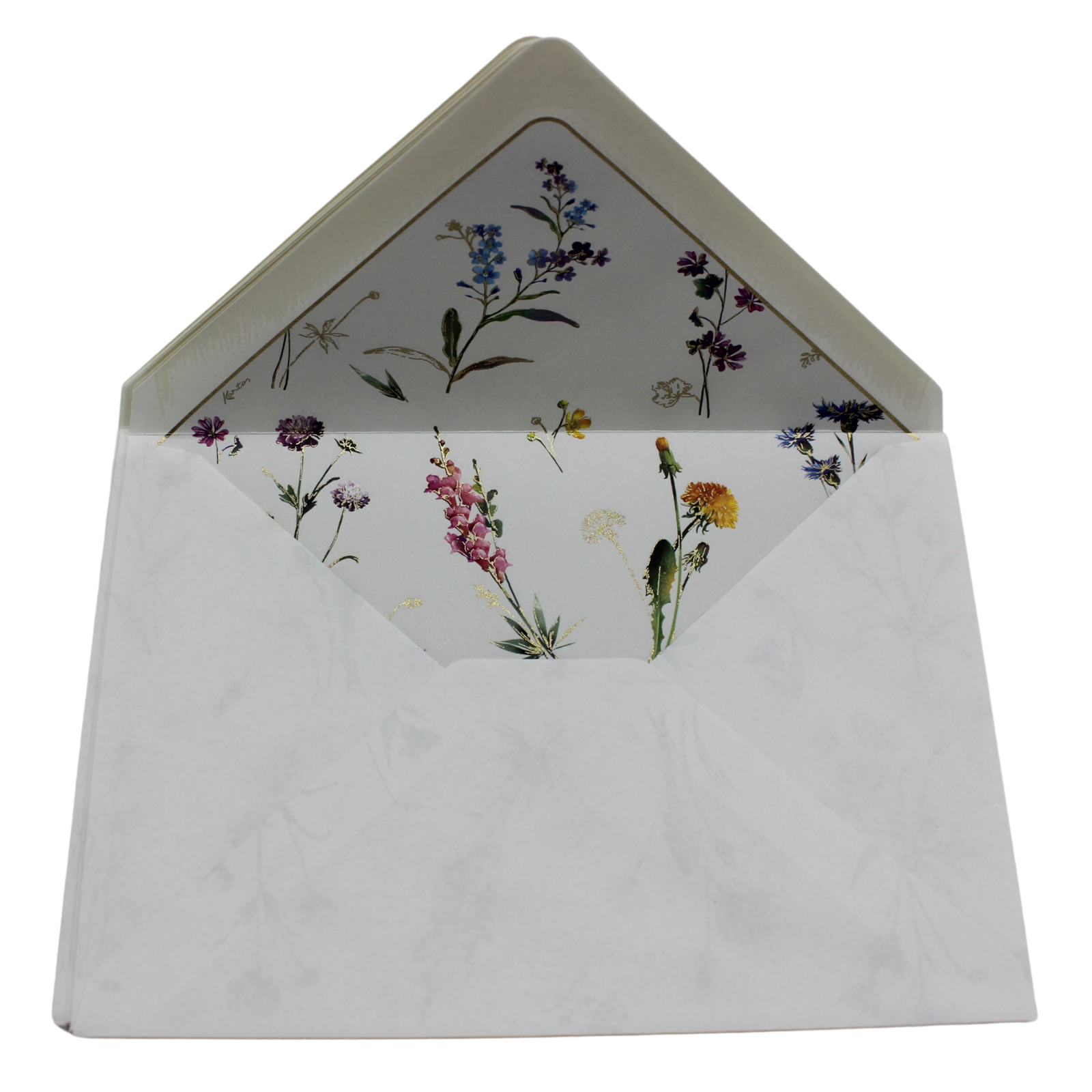 Passend zu dem Briefpapier sind die Briefumschläge hergestellt. Die Innenseiten sind mit dem Wild Flowers-Motiv ausgeschlagen und bilden den krönenden Abschluss dieses Briefetuis.