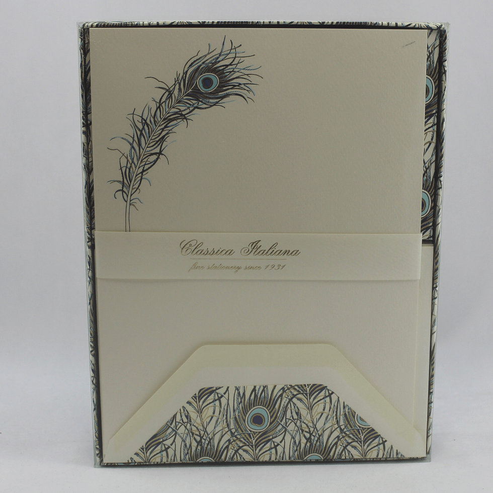 Passend zu dem Briefpapier sind die Briefumschläge hergestellt. Die Innenseiten sind mit dem Pfauenfeder Motiv ausgeschlagen und bilden den krönenden Abschluss dieser Geschenkbox.