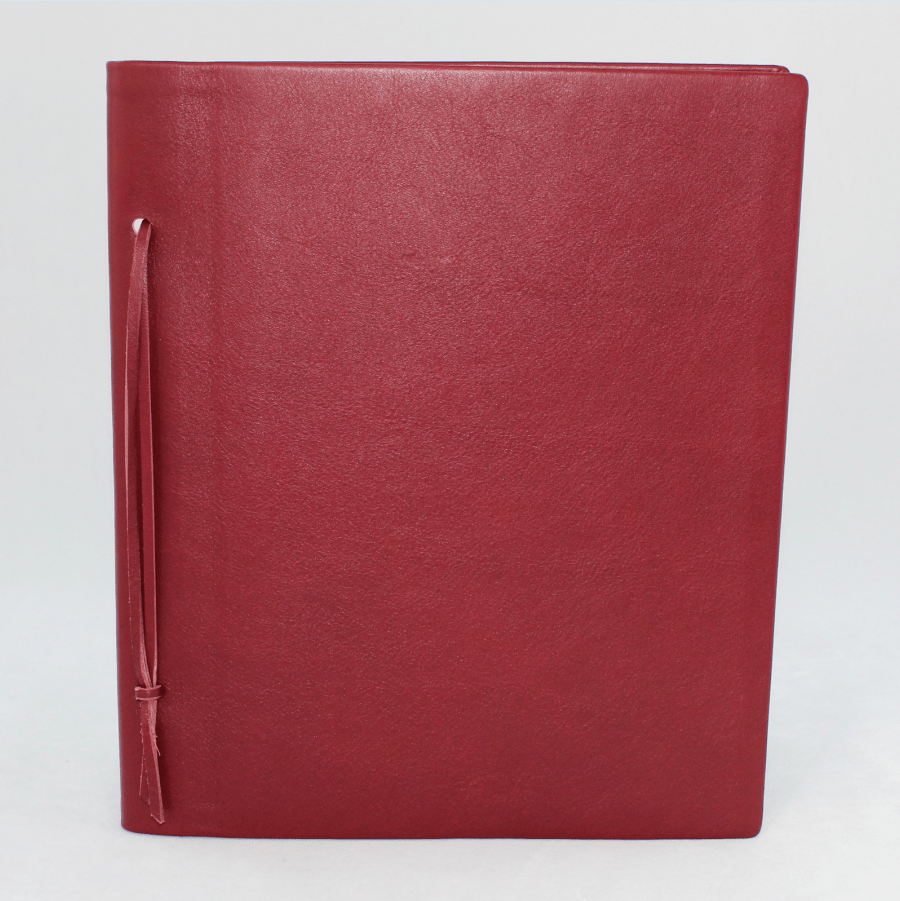 Die elegante Business-Mappe aus hochwertigem Vollrindleder in bordeaux, ist mit einem chamoirefarbenem handgerissenem Büttenpapier versehen. Der Bucheinband ist mit passendem Lederriemchen gebunden.