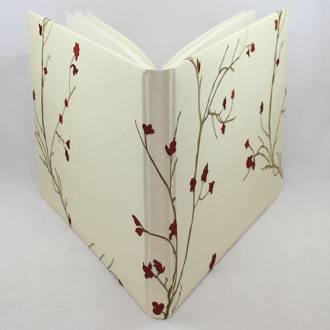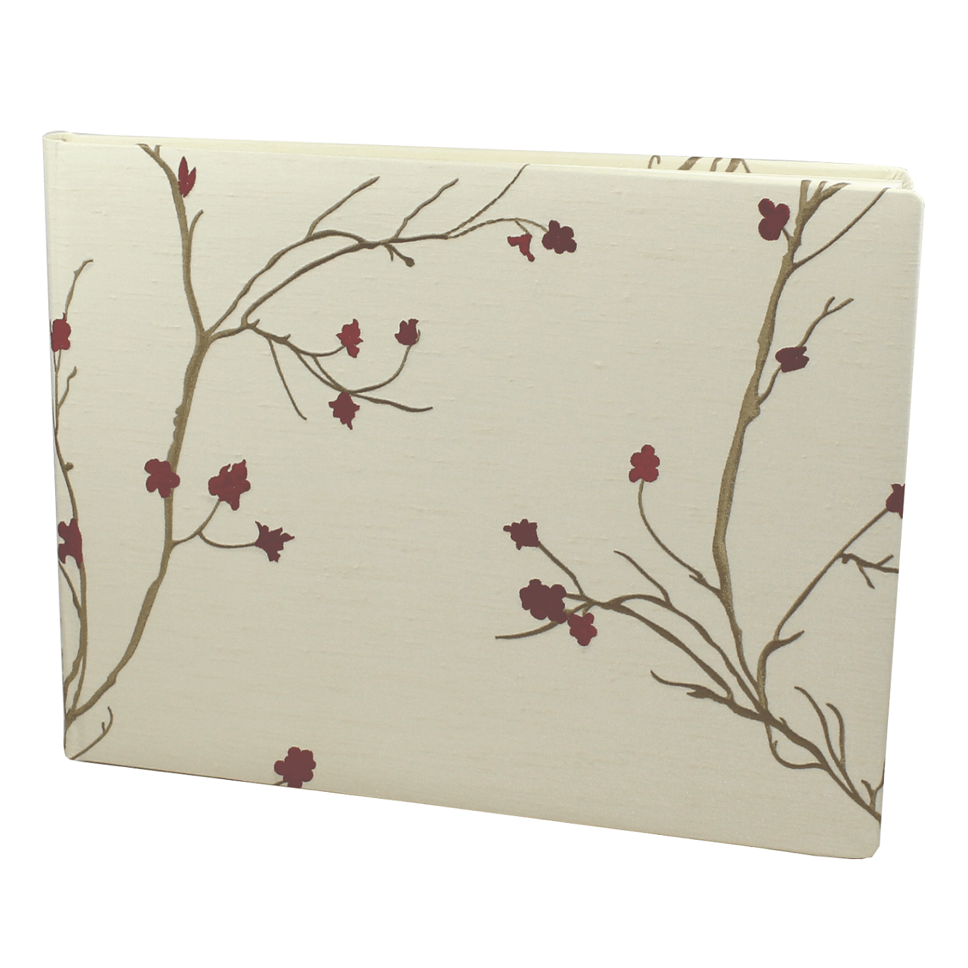 Das edle Foto-Gästebuch Bonsai aus feinem Seidenstoff ist in deutscher Handarbeit hergestellt und mit seinen eleganten roten Blumenstickereien im Japanlook sehr beliebt.