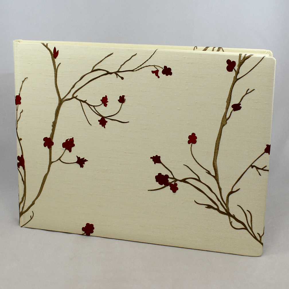 Das Erscheinungsbild des Foto-Gästebuches wird  durch die besonders aufwendigen Stickereien im Japanlook geprägt. Sowohl die Äste wie auch die roten Blüten wurden sehr filigran gestickt.