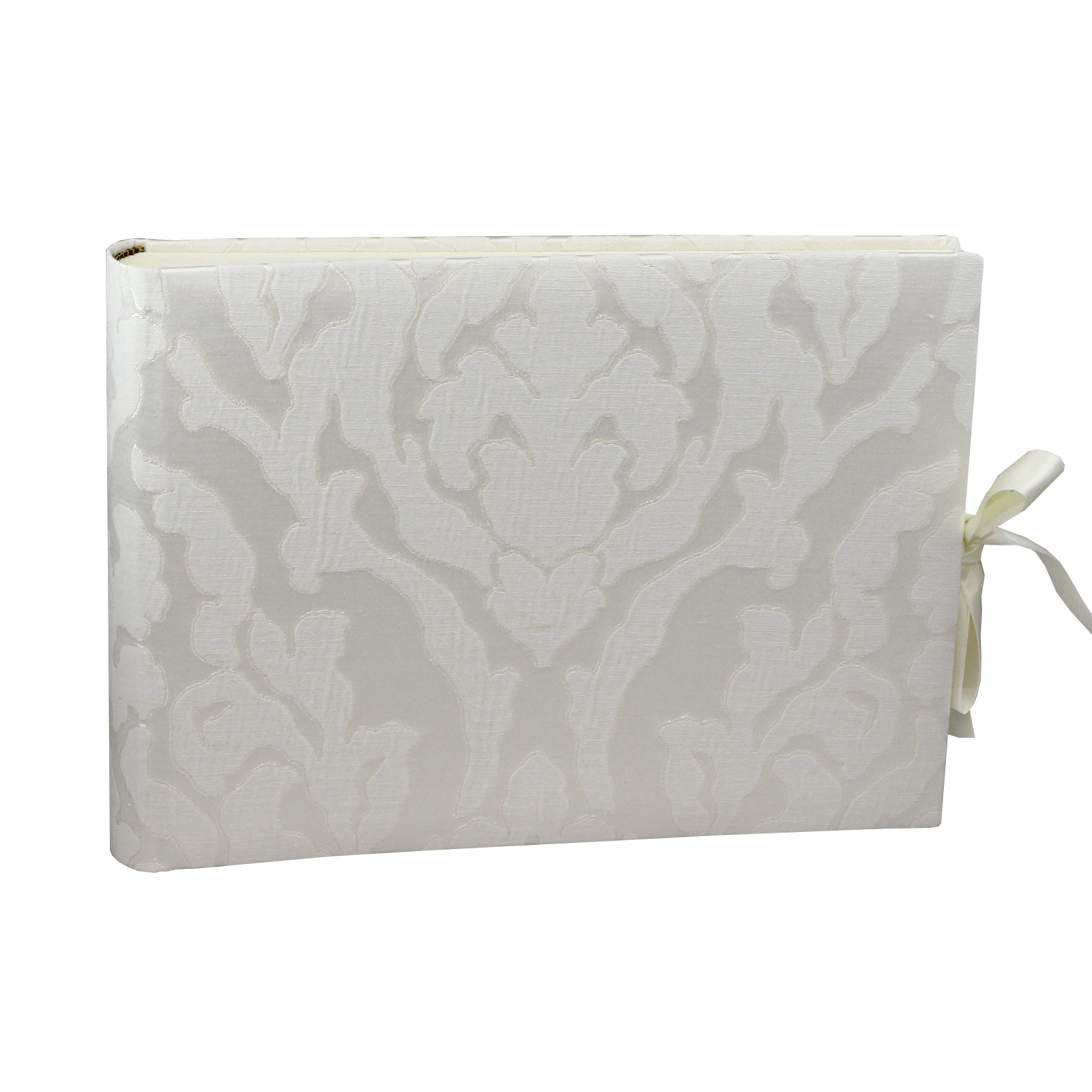 Das Erscheinungsbild des Foto-Gästebuches wird stark durch die aufwendigen Korallenwebungen geprägt. Auf dem hochwertigen cremefarbenen Baumwollstoff kommen die Ton-in-Ton Korallenmuster aus glänzenden und mattweißen Stoffananteilen besonders schön zur Geltung. Ein weißes Satinband ist fest im Einband eingearbeitet und schmückt das Foto-Gästebuch Davoli mit einer hübschen Schleife.