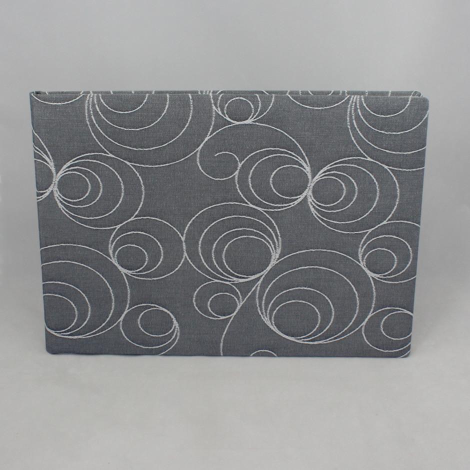 Das Foto-Gästebuch Lisa mit seinen pastellfarbenen blauen Baumwollstoff und den kreisförmigen weißen Stickereien, besticht durch seine schlichte Eleganz.
