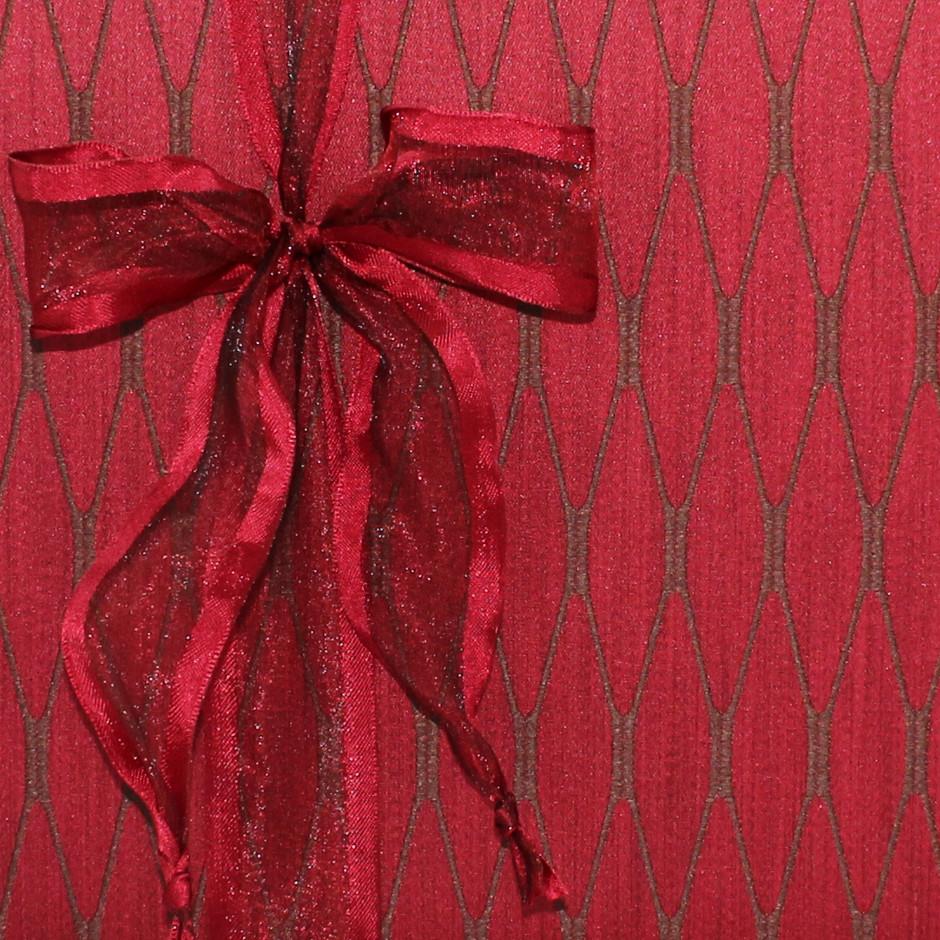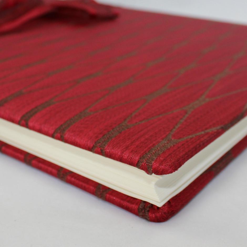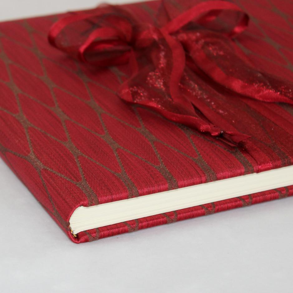 Das Erscheinungsbild des Gästebuches wird durch den edlen roten Mailänder Stoff in Rauten Optik geprägt. Eine farblich passende Schleife rundet das Erscheinungsbild perfekt ab.