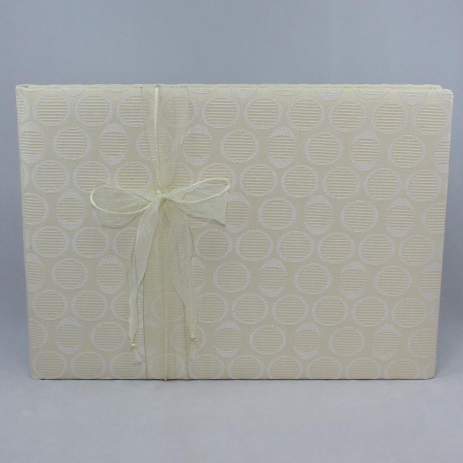 Das Foto-Gästebuch Roma besticht durch seinen chamoirefarbenem Stoffeinband mit seinen kreisförmigen seidenen Einwebungen.