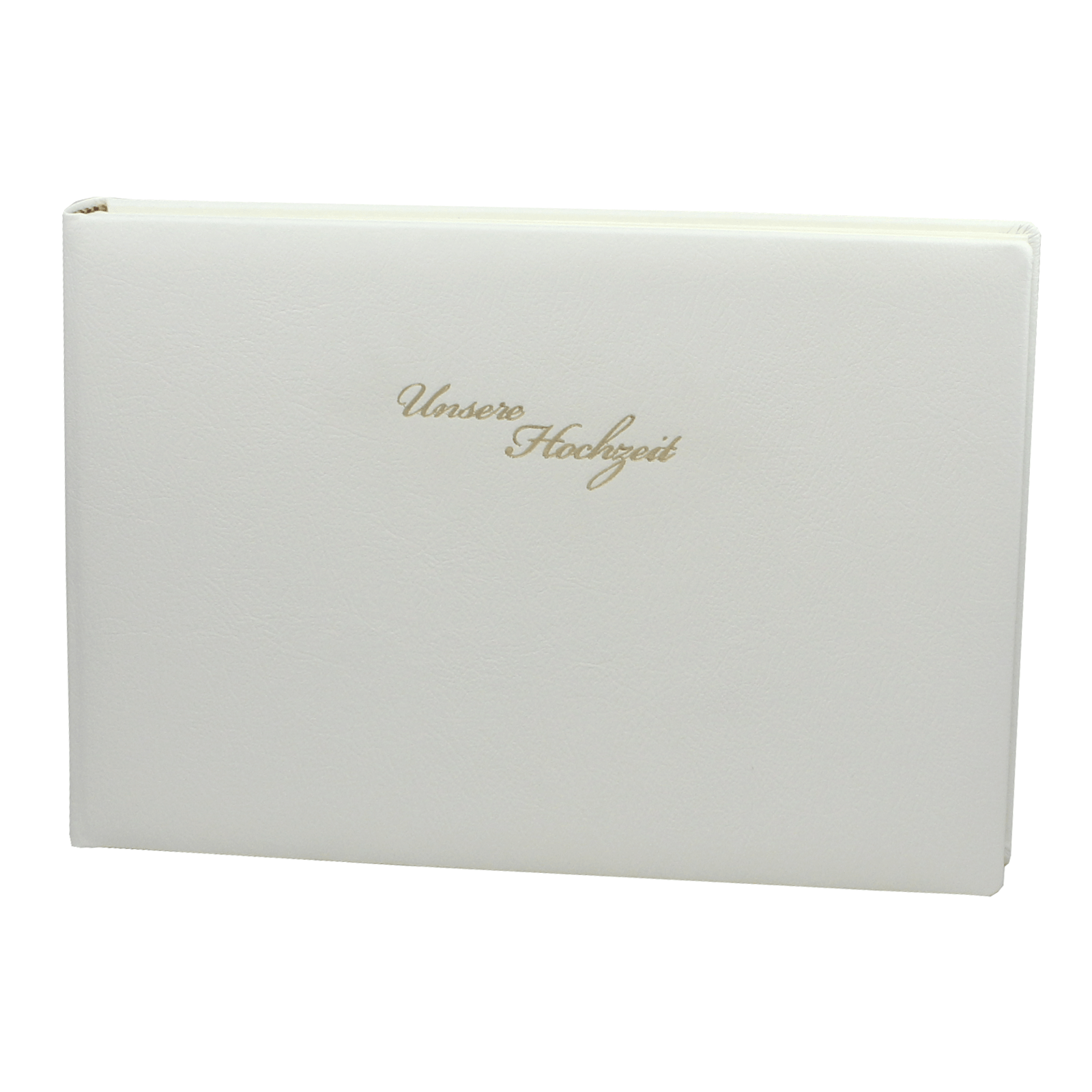 Die Vorderseite des Foto-Gästebuchs ziert die edle Goldprägung „Unsere Hochzeit“, die nicht nur den Inhalt ankündigt, sondern auch das Wertvolle des Augenblicks betont.