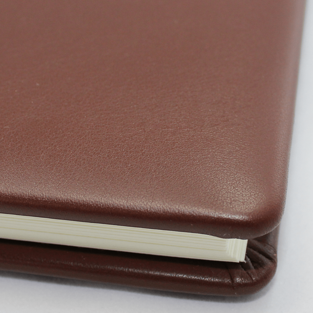 Damit das Foto-Gästebuch Zeus aus braunem Vollrindleder seine besonders weiche Haptik erhält, wird der Ledereinband in Softcover hergestellt. Ein weiteres besonderes Merkmal reiner Handarbeit sind die von Hand eingezogenen „runden Ecken“.