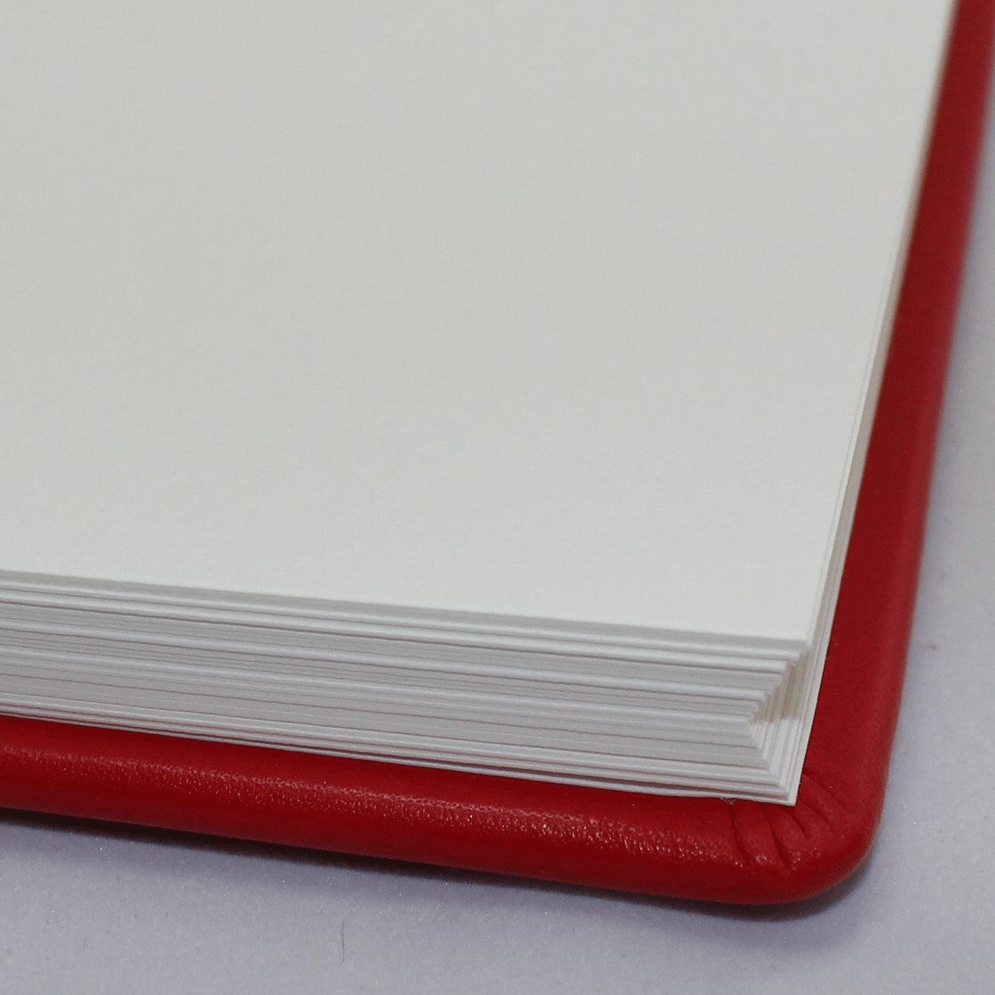 Damit das Foto-Gästebuch Zeus aus rotem Vollrindleder seine besonders weiche Haptik erhält, wird der Ledereinband in Softcover hergestellt. Ein weiteres besonderes Merkmal reiner Handarbeit sind die von Hand eingezogenen „runden Ecken“.