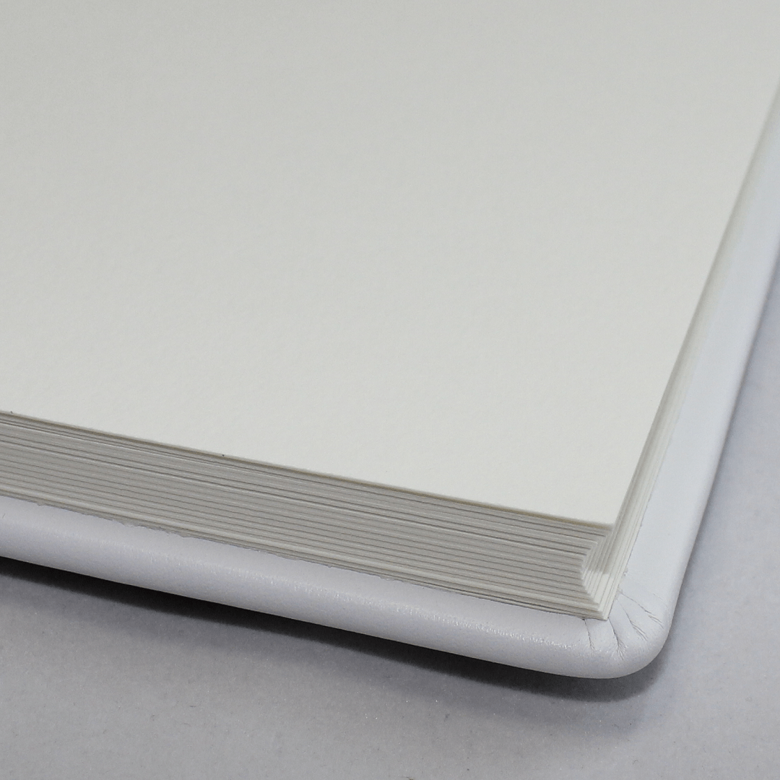 Damit das Foto-Gästebuch Zeus aus weißem Vollrindleder seine besonders weiche Haptik erhält, wird der Ledereinband in Softcover hergestellt. Ein weiteres besonderes Merkmal reiner Handarbeit sind die von Hand eingezogenen „runden Ecken“.