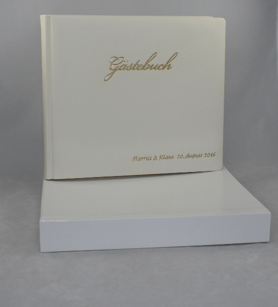 Das Foto-Gästebuch Zeus aus weißem Vollrindleder kann auf Wunsch mit einer individuellen Prägung versehen werden. Lassen Sie den Schriftzug „Gästebuch“ in Gold, Silber oder Blindprägung aufbringen, oder fragen Sie nach einem Angebot für die Prägung Ihres Firmenlogos oder Namen und Daten für besondere Anlässe.