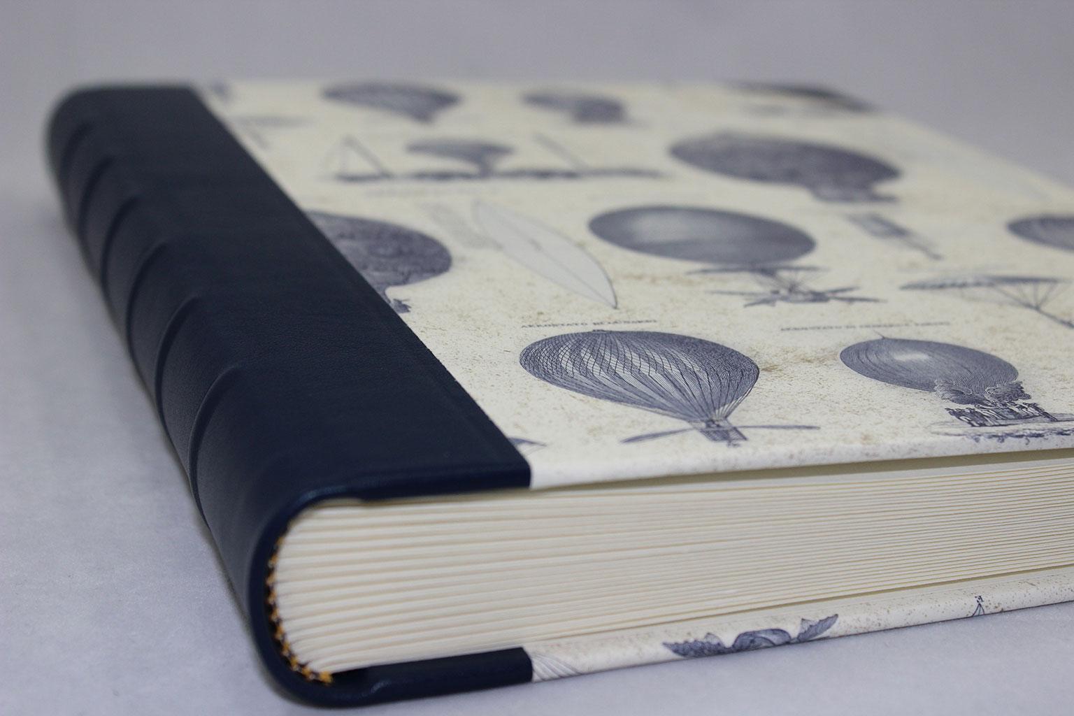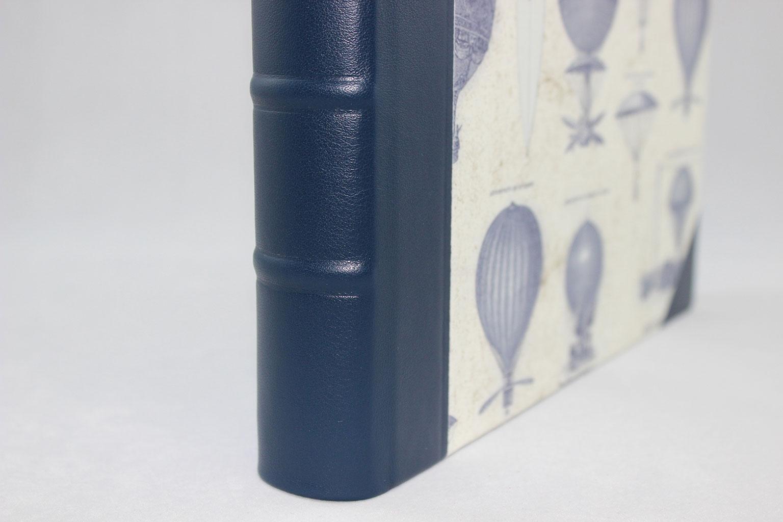 Das Fotoalbum Aereonautica mit blauem Leder wird aus einer Kombination von fassgegerbtem italienischen Vollrindleder in blau und edlem Designpapier gefertigt. Es wird von uns in rein deutscher buchbinderischer Handarbeit hergestellt. Der Hartcover Papierbezug ist mit im Vintage-Look gezeichneten Luftfahrtzeugen und Heißluftballons bedruckt. Neben den von Hand eingezogenen runden Lederecken, ist der Buchrücken mit klassischen Bünden in Leder gefasst.