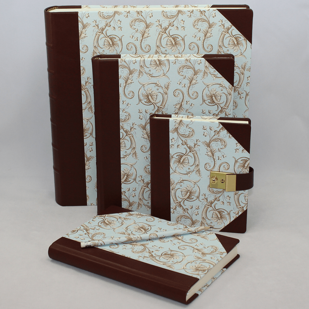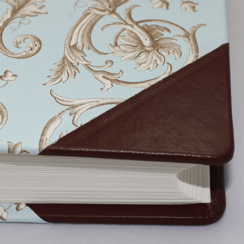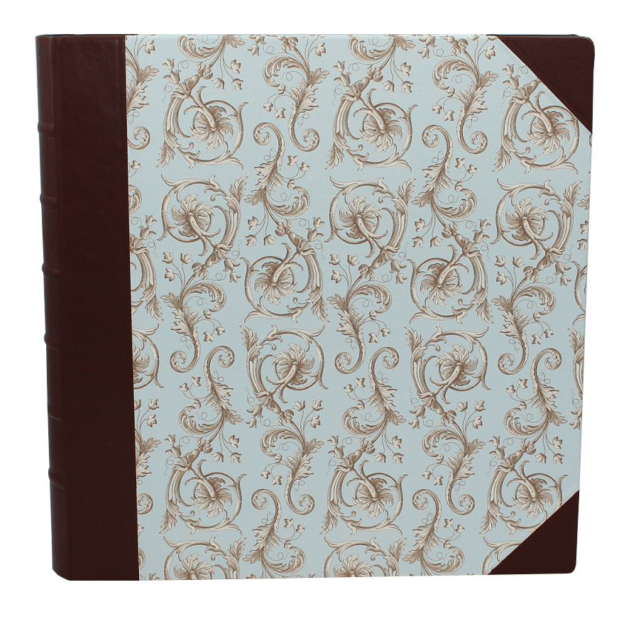 Das Erscheinungsbild des Fotoalbum Aquamarin aus Halbleder wird durch seinen hochwertigen Papierbezug mit eleganten Schnörkeln im Barockstil geprägt. Die Farbkombination aus braunem Vollrindleder und zartem Aquamarin wirkt besonders edel.