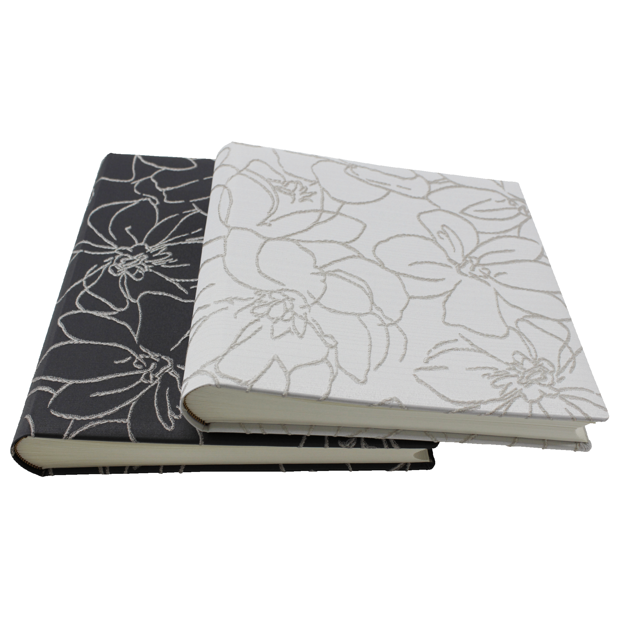 Das Fotoalbum Corinna im Baumwoll-Seide-Einband besticht durch seinen eleganten Softcovereinband aus hochwertiger grauer oder naturweißer Baumwoll-Seide mit Blumenstickereien. Das Produkt wird in reiner deutscher Handarbeit hergestellt.