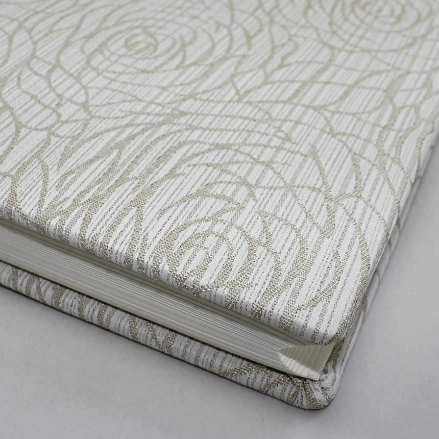 Dieses elegante Album der Vera Donna Manufaktur, wird in reiner deutscher buchbinderischer Handarbeit hergestellt und besticht durch seinen kunstvoll gewebten Stoffeinband mit Rosenmuster.