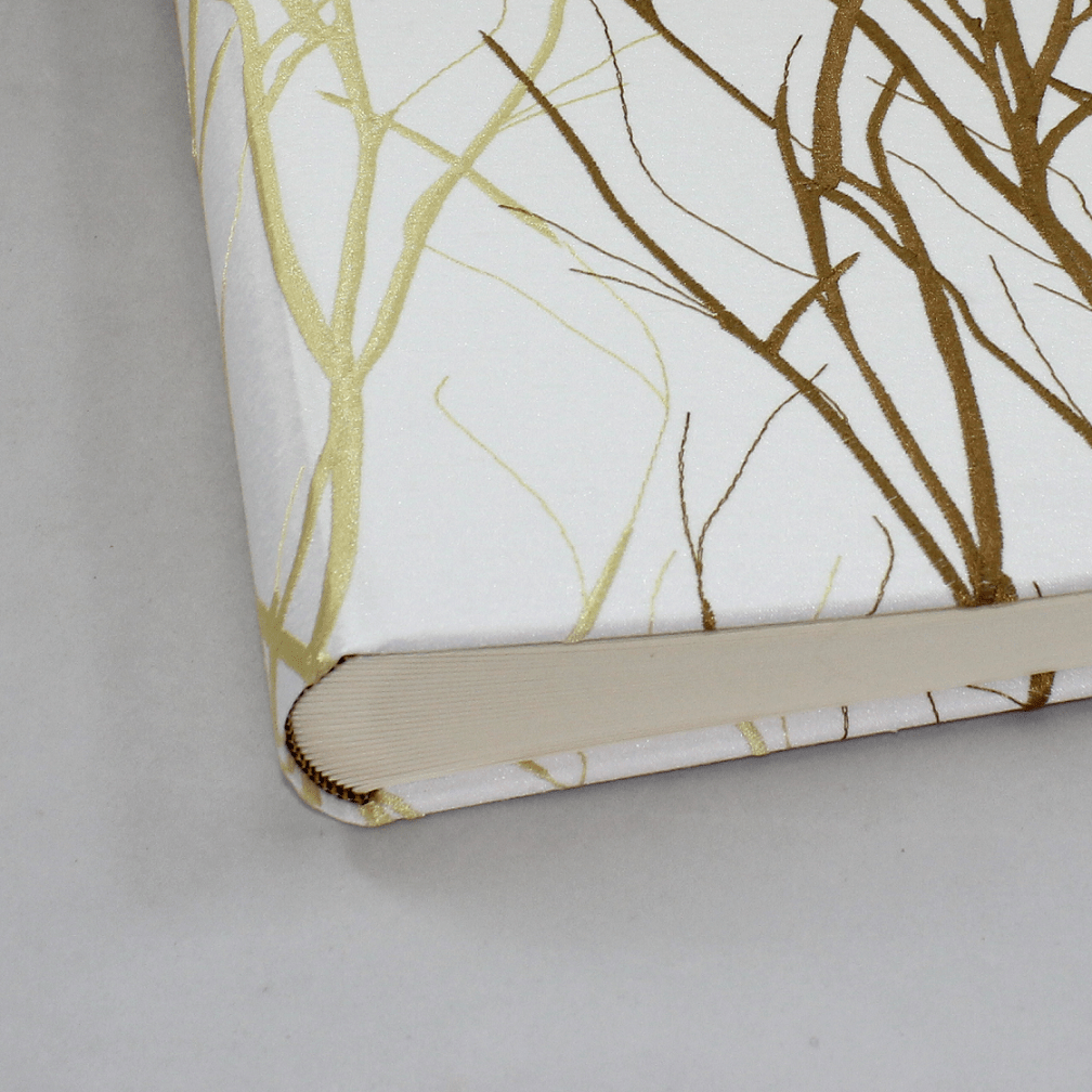 Das edle Fotoalbum Jasmin groß im Stoffeinband mit gestickten Zweigen besticht durch seinen fein gewebten Baumwollstoff mit hochwertigen Stickerein in Form von Zweigen und Ästen.