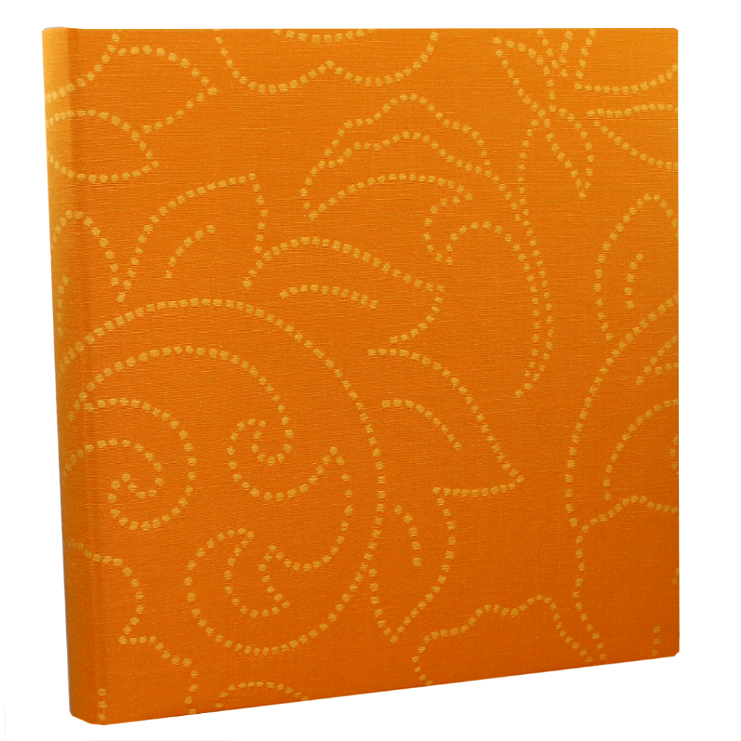 Das Fotoalbum Lara orange besticht durch seinen eleganten Softcovereinband aus edlem Baumwollstoff mit orangen Stickereien, die in gepunkteten Linien ein elegantes Blumenmuster stilisieren. Das Fotoalbum wird in reiner deutscher buchbinderischer Handarbeit hergestellt.