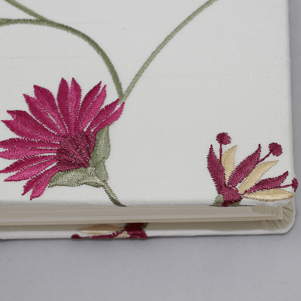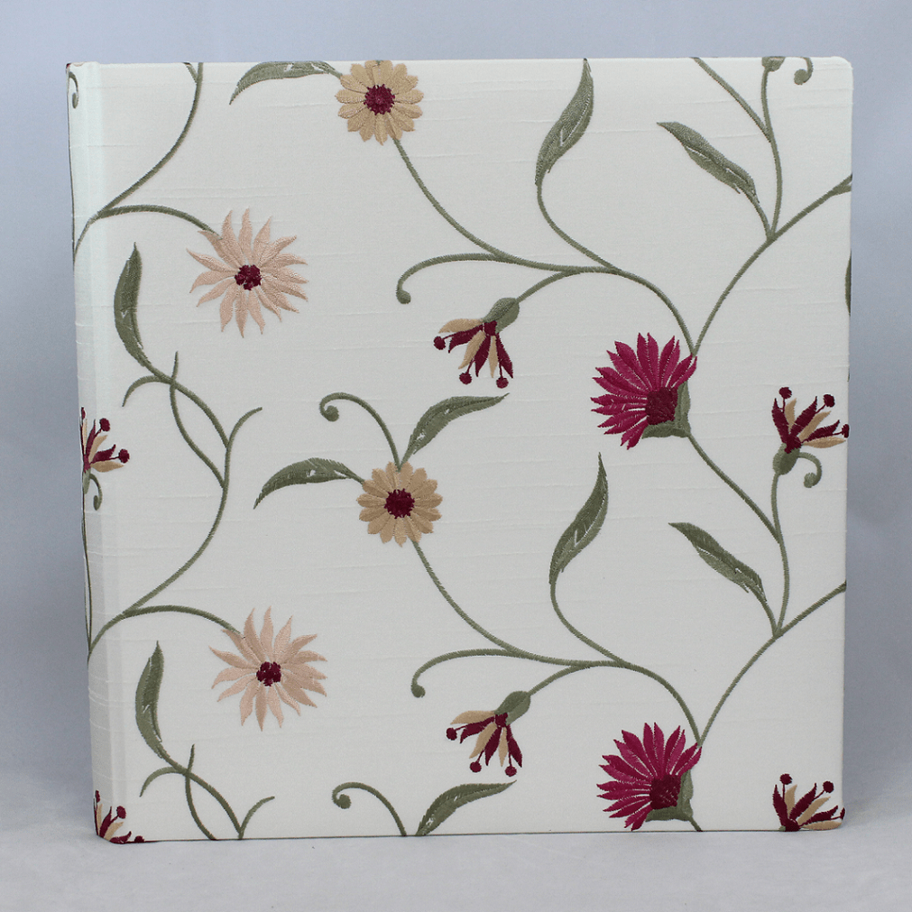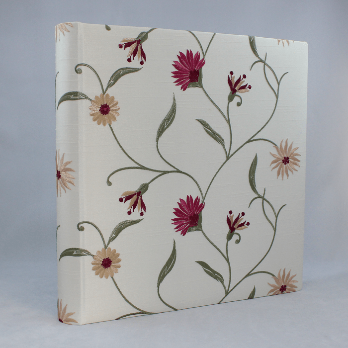 Das wunderschöne Fotoalbum Leanne groß besticht durch seinen hochwertigen cremefarbenen Seidenstoff mit aufwendigen Blumenstickereien.