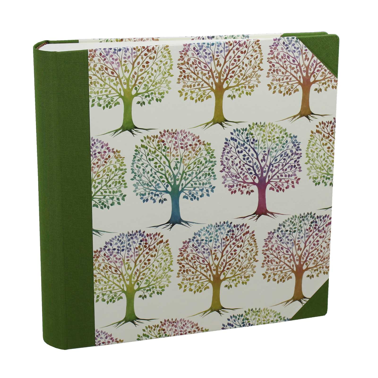 Der Papiereinband ist bedruckt mit stilisierten Baummotiven, der grüne Buchbinderleinen verleiht diesem Fotoalbum zudem eine zeitlose Eleganz. Der Einband besteht aus stabiler Kartonage, die Ihre Fotos sicher schützt und das Album langlebig macht.