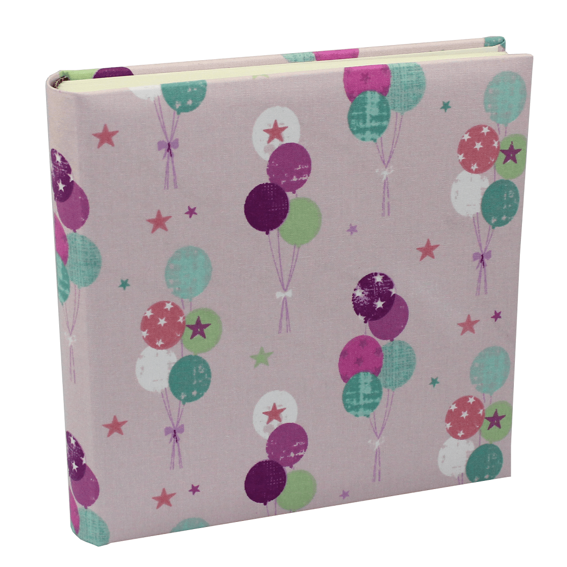 Das Fotoalbum Luftballons in rosé-pink besticht durch seinen bunt bedruckten französischen Baumwolleinband. Auf roséfarbenem Untergrund sind liebevoll gestaltete Luftballons und kleine Sterne in Türkis- und Pinktönen  abgebildet.