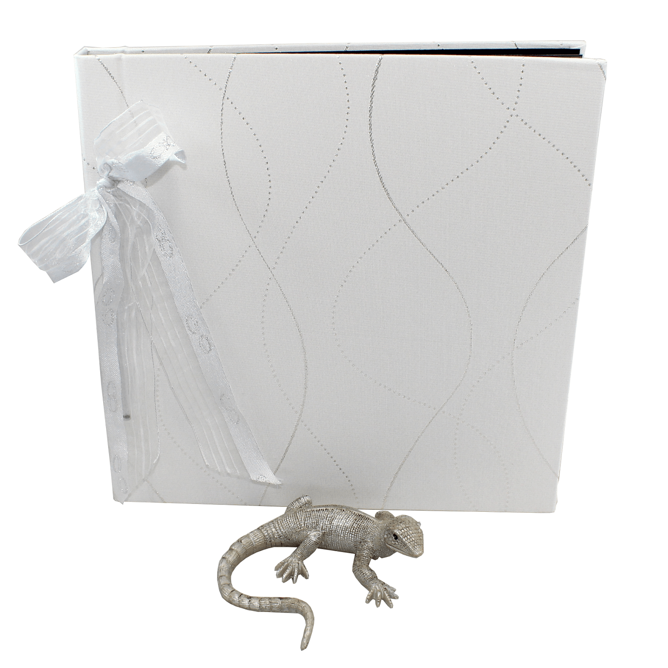 Das wunderschöne Fotoalbum mit Kordelbindung Genova in weiß besticht durch seine wellenförmigen Einwebungen mit glänzendem Silbergarn. Mit einer eleganten Organza-Schleife wird das Album dekorativ zusammengehalten und kann jederzeit zur Gestaltung der einzelnen Seiten geöffnet werden. Das Fotokordelalbum ist in den Größen 270 x 270 mm und 320 x 320 mm erhältlich. Bitte wählen Sie bei der Bestellung Ihre Wunschgröße aus.