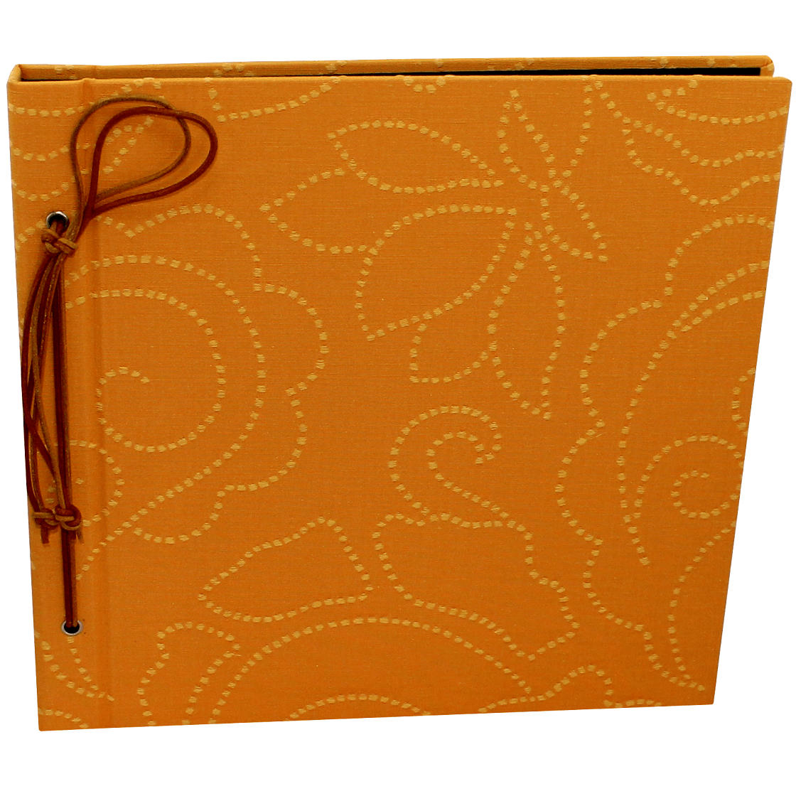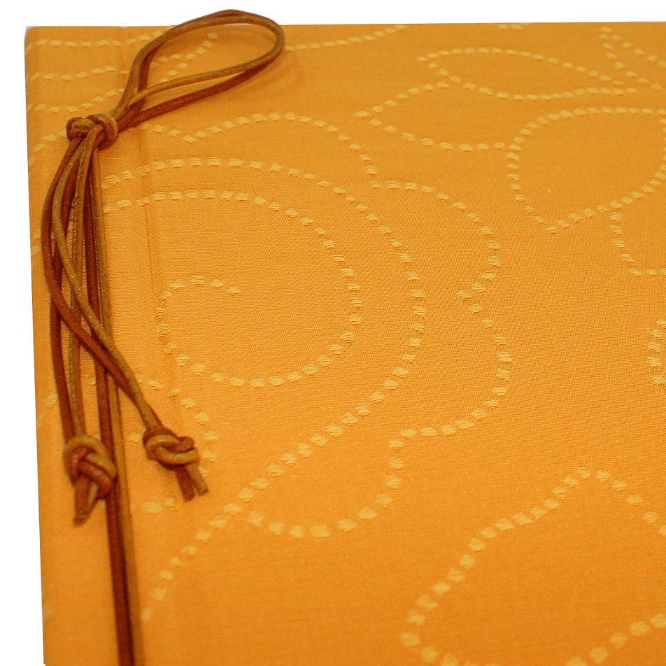Das wunderschöne Fotoalbum mit Kordelbindung Lara Orange besticht durch seinen farbenfrohen Einband aus edlem Baumwollstoff mit orangen Stickereien, die in gepunkteten Linien ein elegantes Blumenmuster stilisieren.