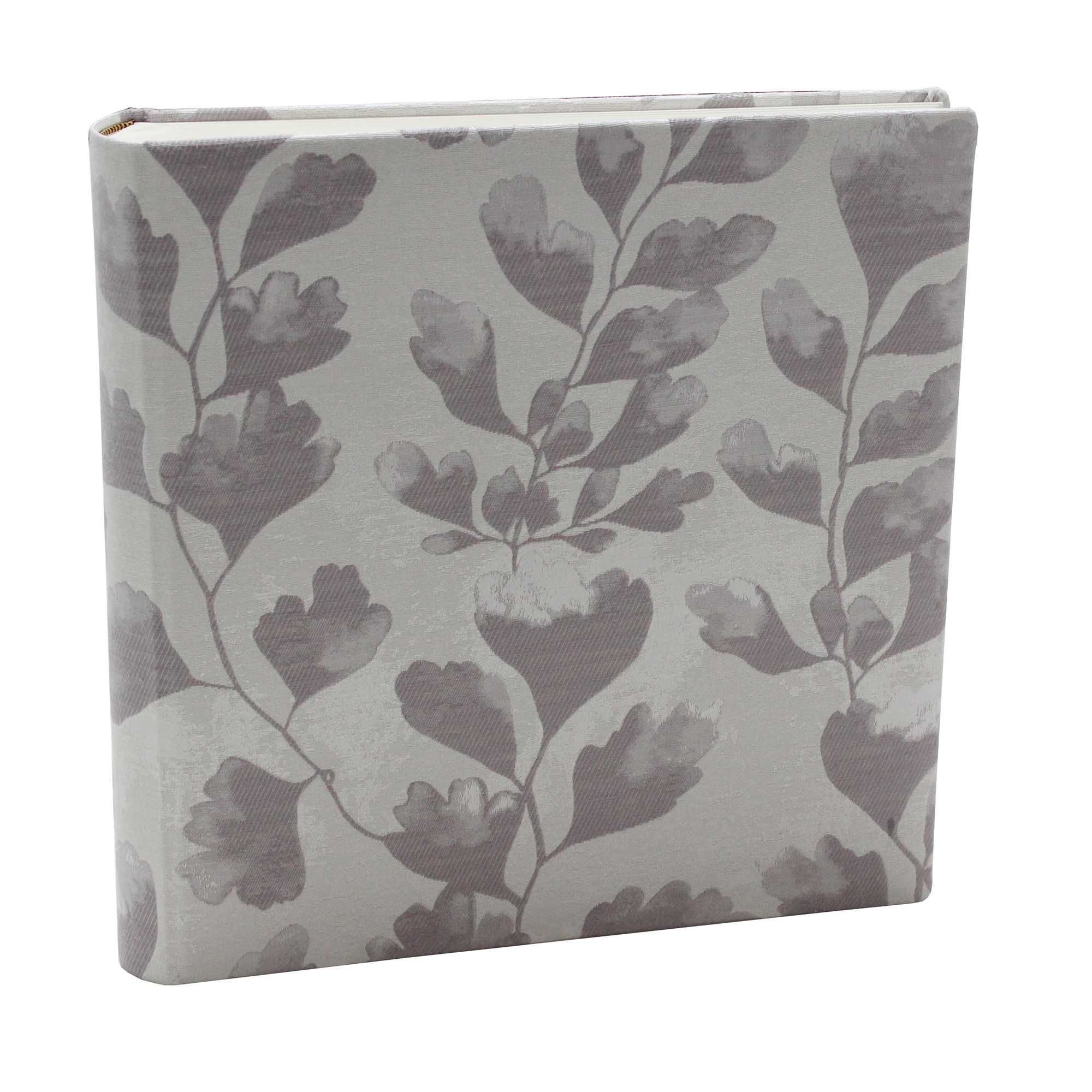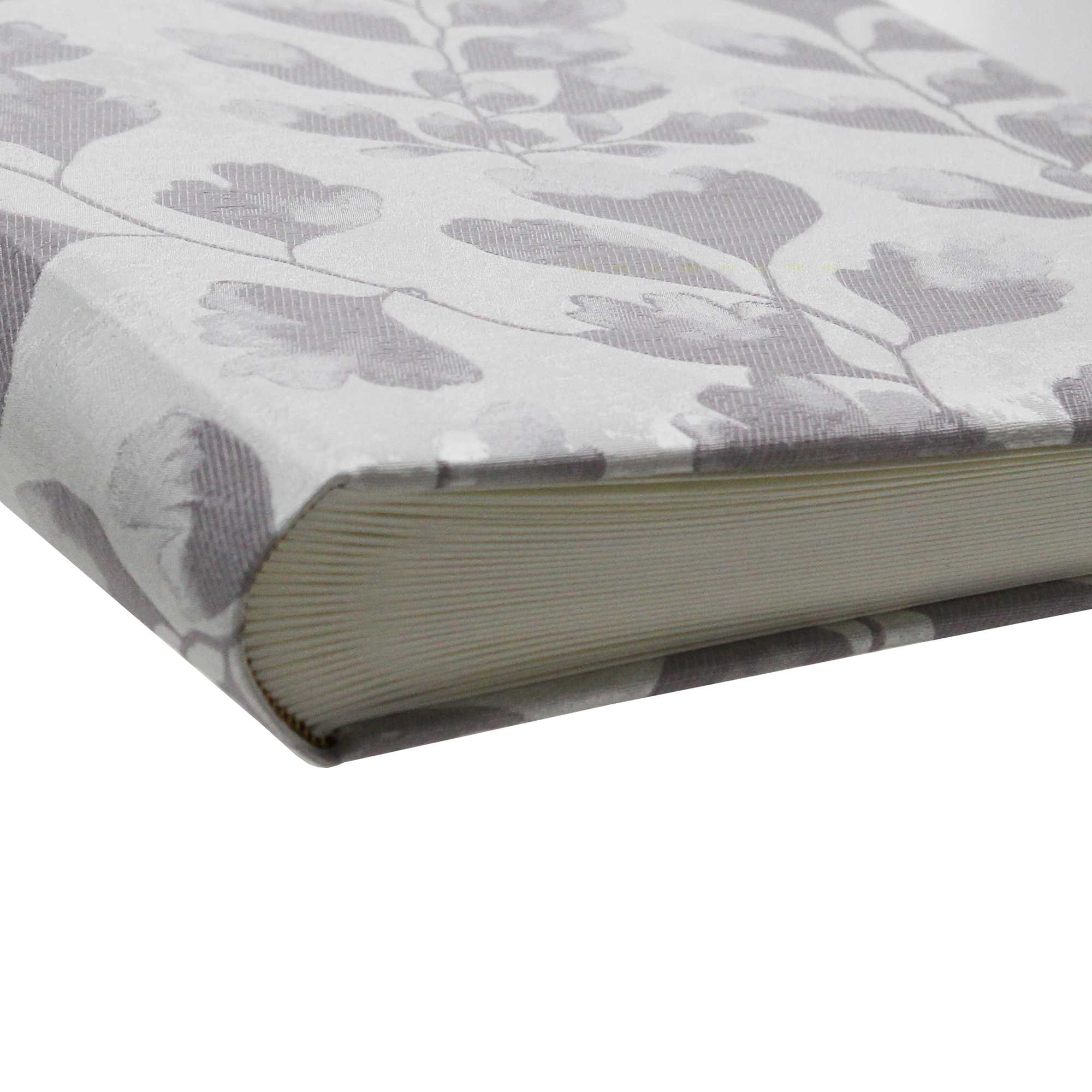 Das Erscheinungsbild des Fotoalbums Monroe wird sehr stark durch das Blätterwerk-Webmuster geprägt das auf dem hochwertigen grauen Leinenstoff besonders gut zur Geltung kommt.