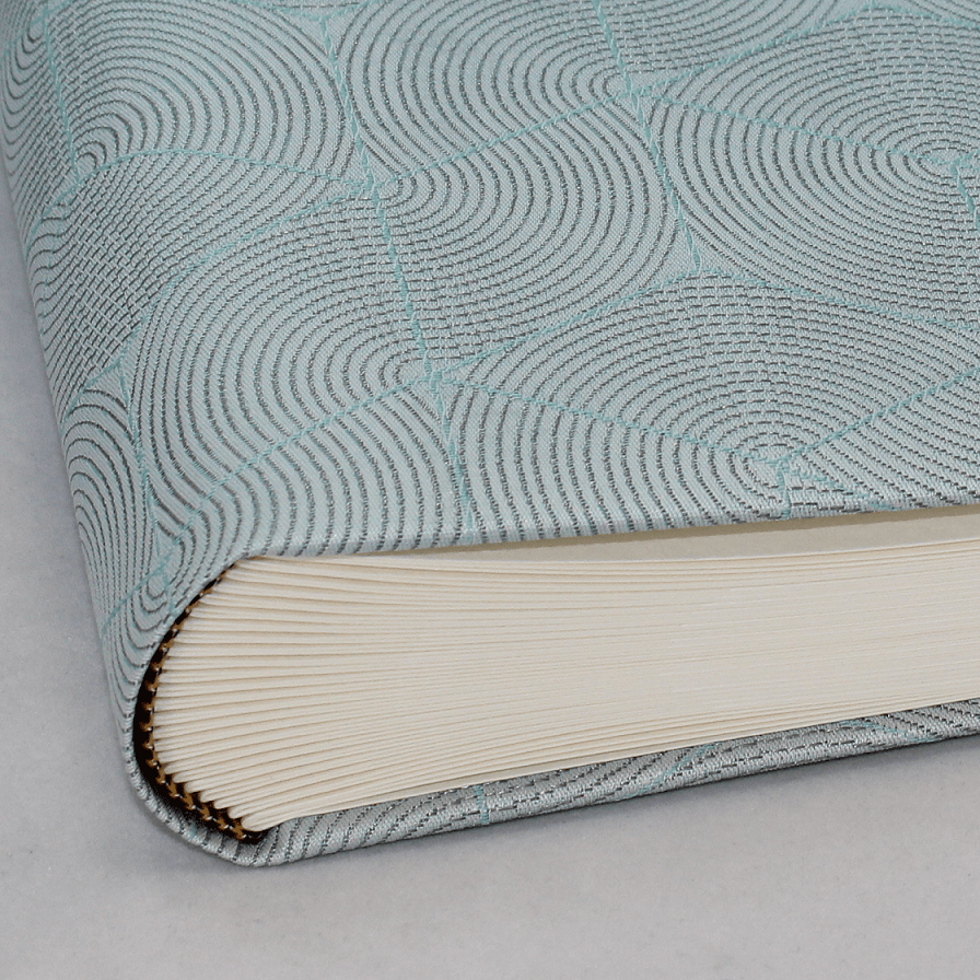 Das Erscheinungsbild des Fotoalbum Sina blau wird  durch seinen in pastel gehaltenen blauen Baumwollstoff im raffinierten Wellenmuster geprägt. Der hochwertige Stoffeinband ist durch natürliche Imprägnierung fleckenabweisend.