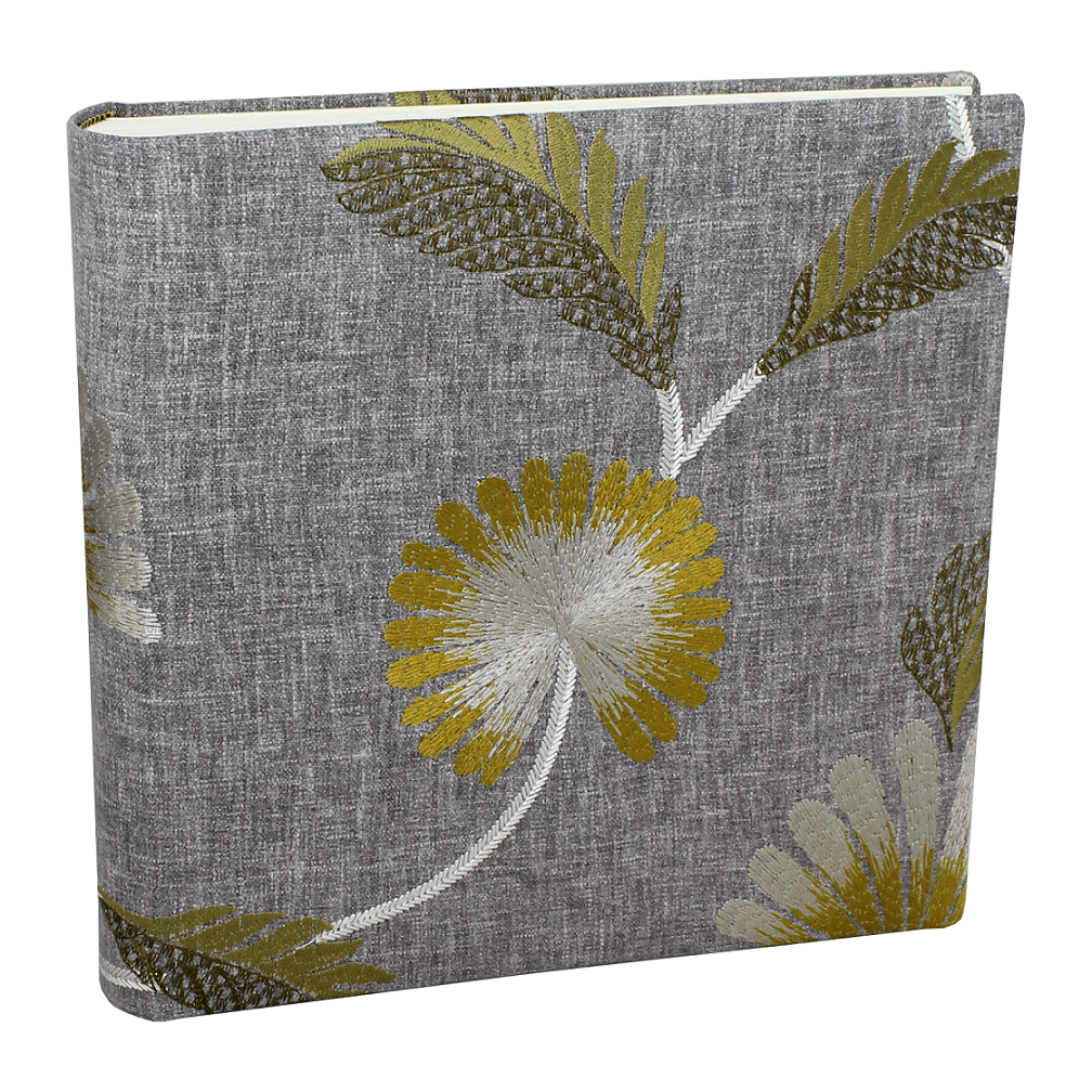 Das Erscheinungsbild des Fotoalbum Willow groß im Stoffeinband mit floraler Stickerei wird durch seinen grau melierten Einband mit wunderschönen großformatigen Stickereien in silbergrau und grün geprägt.
