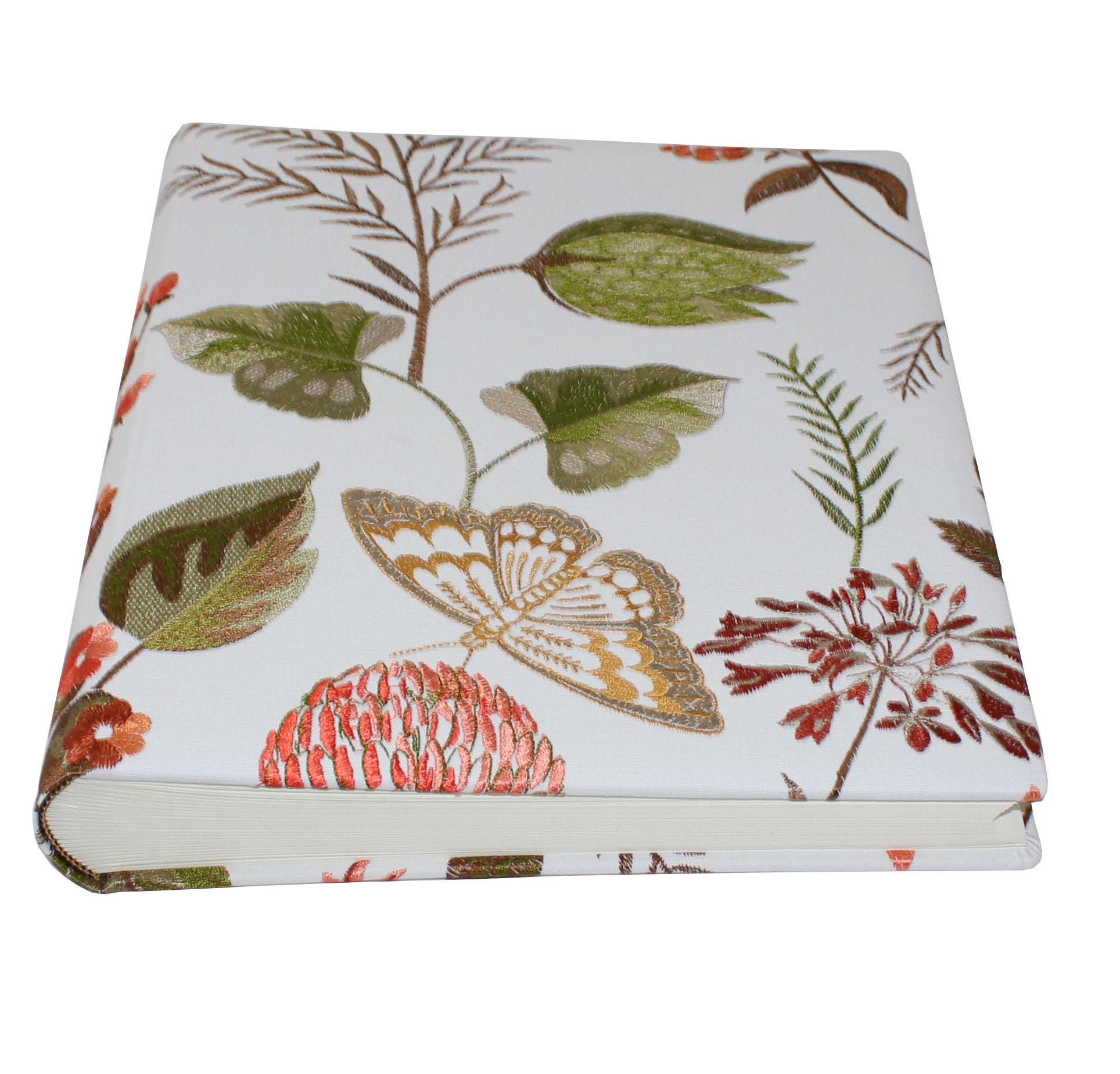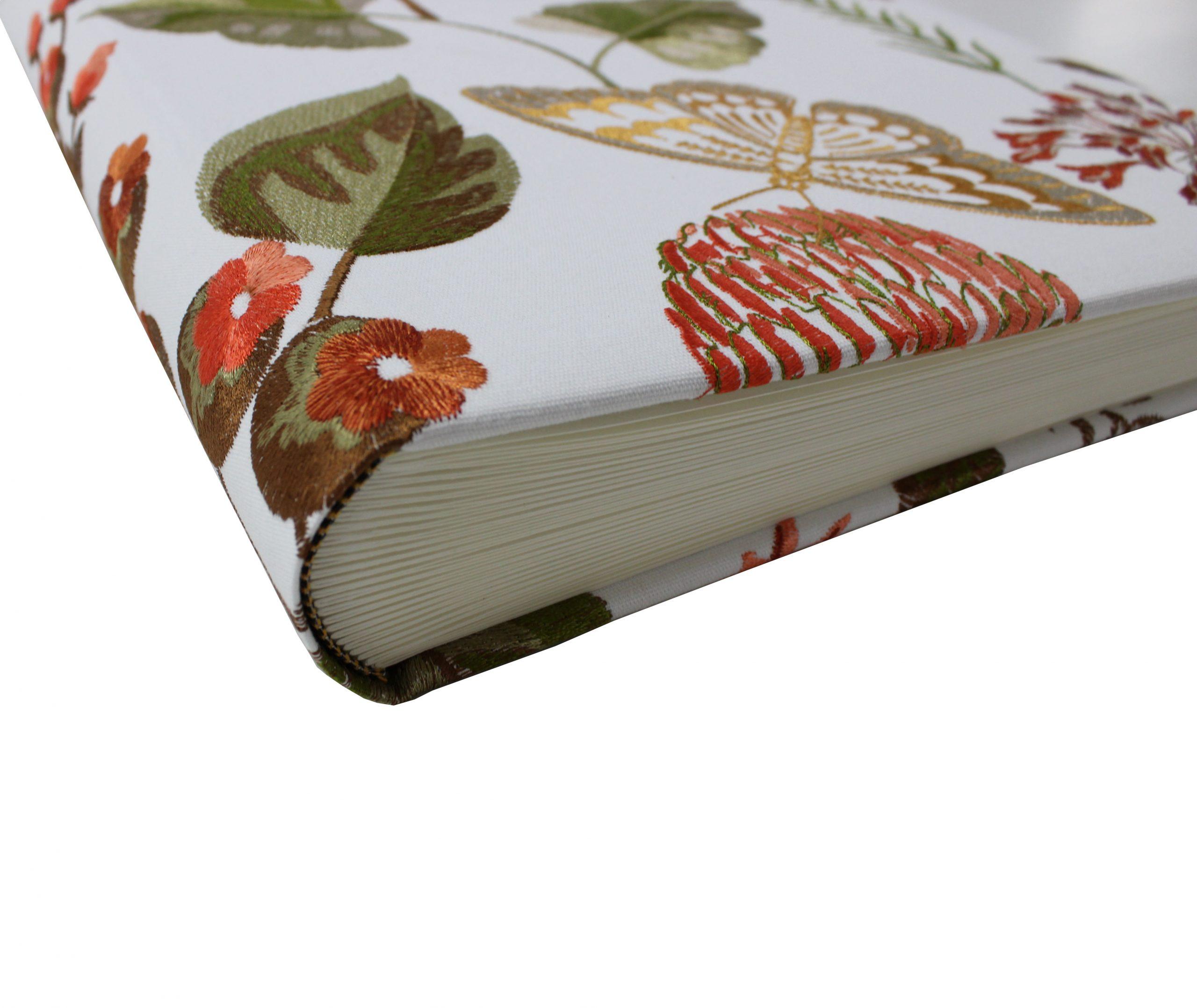 Das Fotoalbum Ava XL besticht durch seinen eleganten Softcovereinband aus hochwertigem natur-weißem Leinenstoff mit bunten herbstlichen Blumenstickereien. Das Produkt wird in reiner deutscher Handarbeit hergestellt.