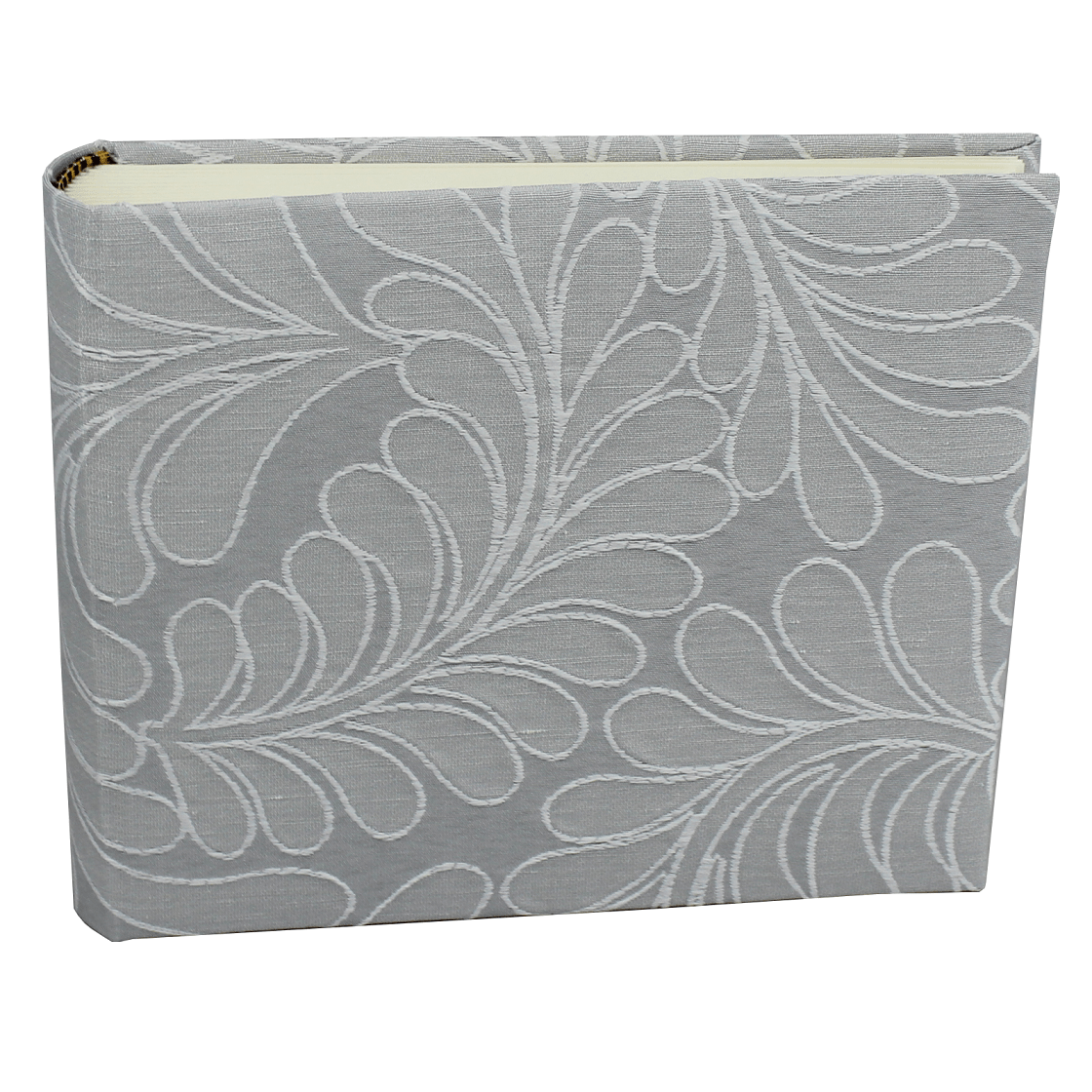 Das Fotoalbum Zara Grau im Querformat besticht durch seinen aufwendig gewebten Stoffeinband. Ein raffiniertes Webmuster aus grauen und cremefarbenen Fäden bildet ein elegantes Muster aus Blattranken.