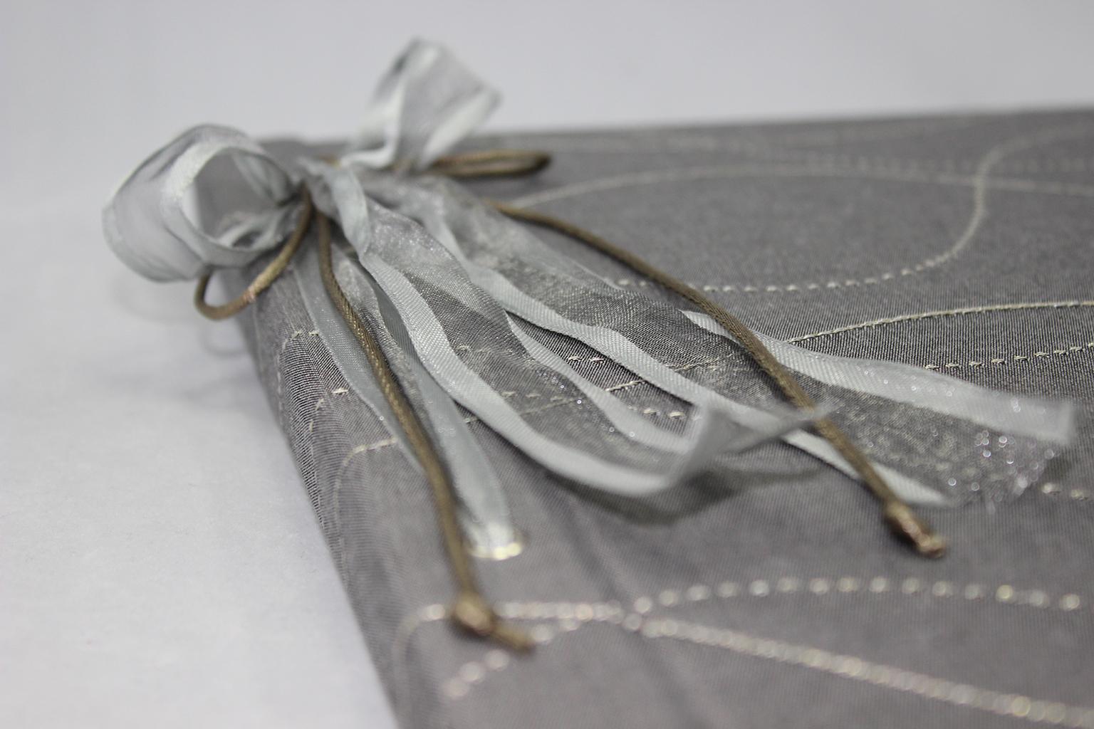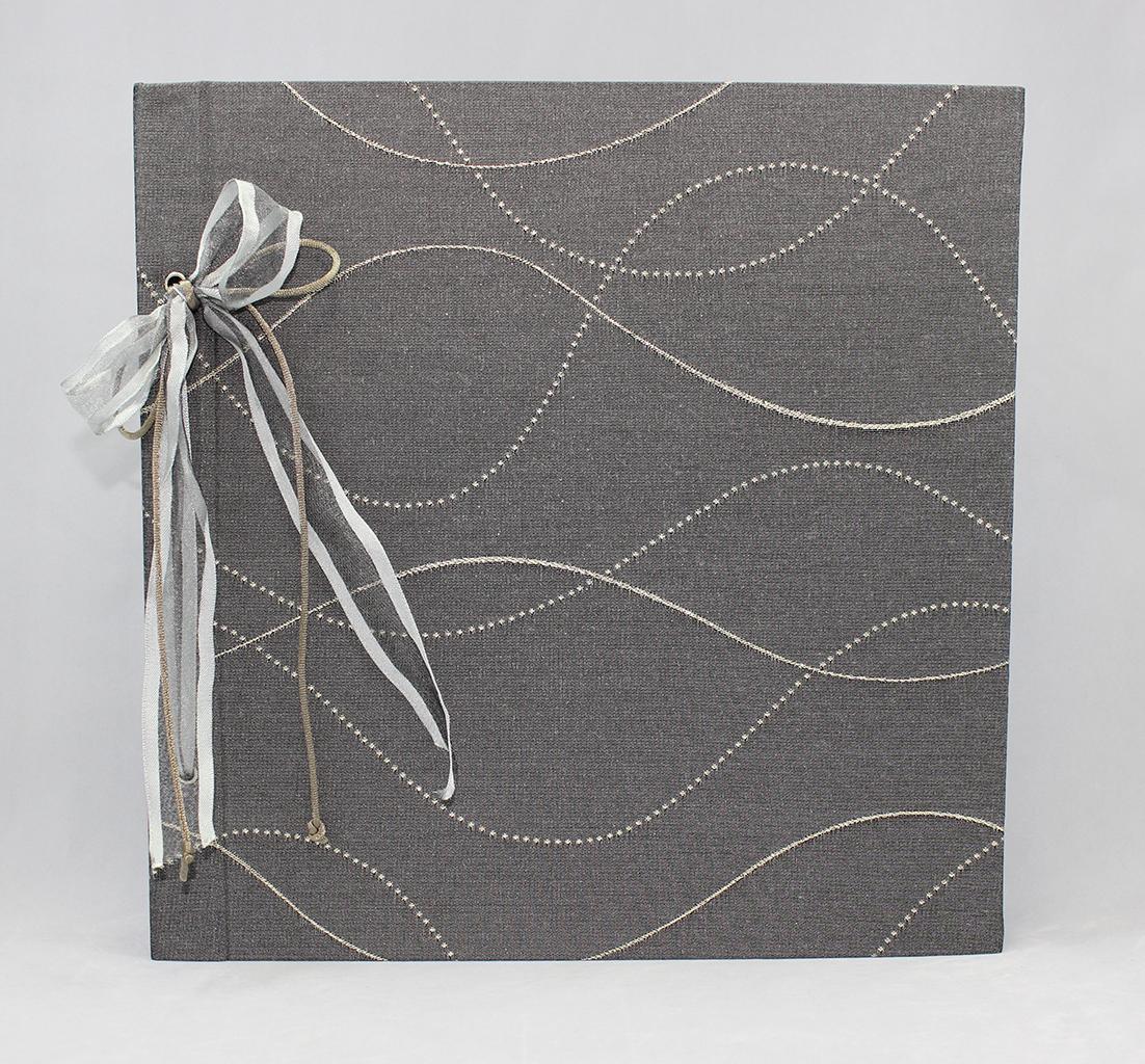 Das geschmackvolle Fotokordelalbum Genova in Silbergrau wird in buchbinderischer Handarbeit gefertigt. Der silbergraue Stoffeinband mit wellenförmigen Einwebungen in Silber wird mit einer farblich passenden Organza-Schleife gebunden. Das Fotoalbum mit Kordelbindung ist in den Abmessungen 270 x 270 mm und 320 x 320 mm erhältlich. Bitte wählen Sie bei der Bestellung Ihre Wunschgröße aus.