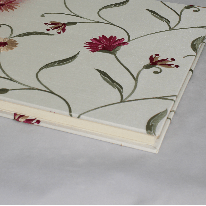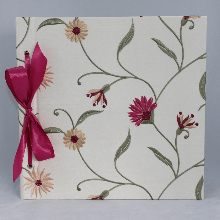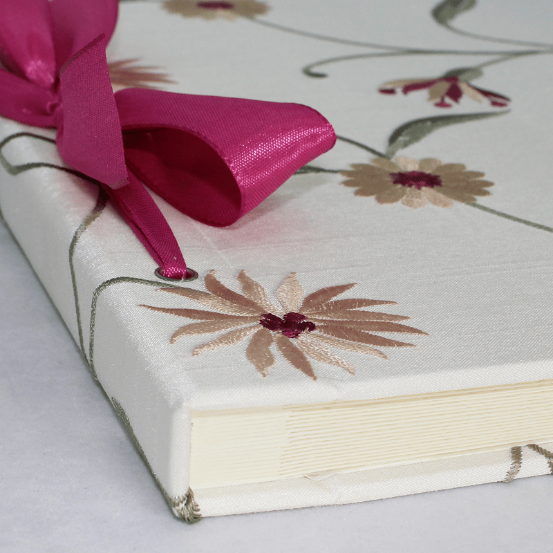 Das wunderschöne Fotokordelalbum Leanne besticht durch seinen hochwertigen cremefarbenen Seidenstoff mit aufwendigen Blumenstickereien und seiner farblich passenden Satinschleife.