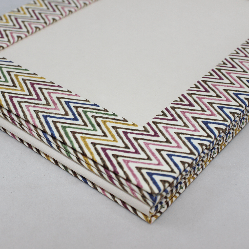 Der wunderschöne Fotorellos Zickzack quer mit Fotorahmen aus in Zickzackmuster bedrucktem Papier besticht durch sein fröhliches Design, sowie die hochwertige Verarbeitung in buchbinderischer Handarbeit. Das Zickzackmuster ist in naturnahen bunten Farbtönen gehalten und wirkt sehr harmonisch. Der Fotorellos bietet Platz für sechs Fotos im Querformat 9×13 bis 10×15.