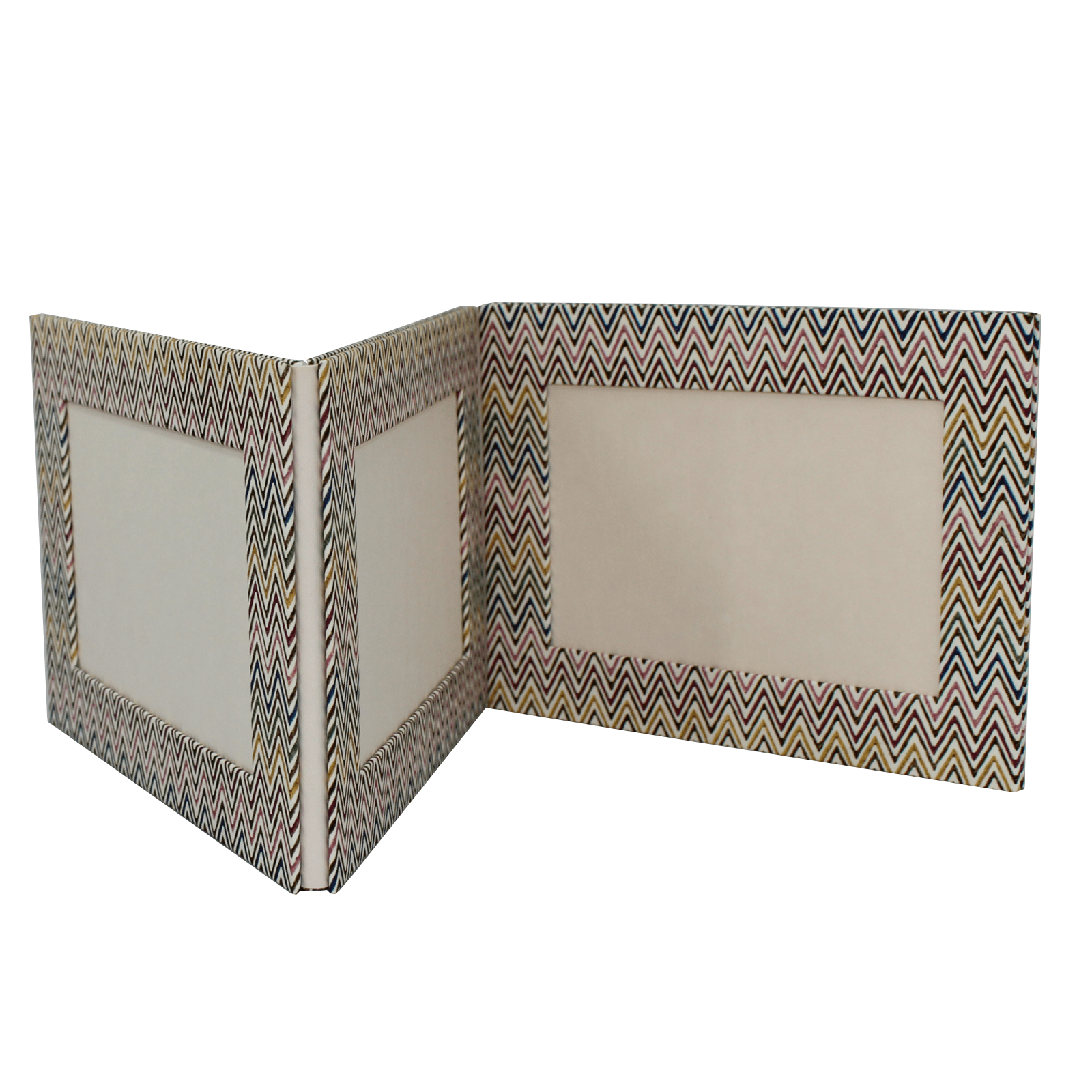 Der wunderschöne Fotorellos Zickzack quer mit Fotorahmen aus hochwertigem Papier besticht durch sein buntes Zickzackmuster aus vielen verschiedenen naturnahen Farben. Von Ocker über Dunkelblau bis Tannengrün und zu Beerentönen wechseln sich die Zickzacklinien mit erdigem Braun auf cremefarbenem Hintergrund ab. Die harmonische Farbgebung, sowie die hochwertige Verarbeitung in buchbinderischer Handarbeit machen diesen Fotorellos zu einem besonderen Blickfang.