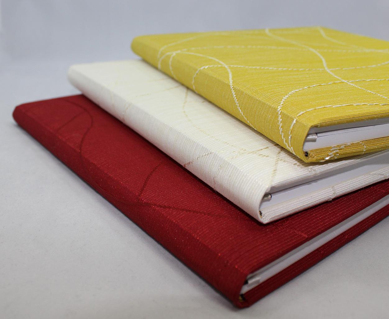 Das Gästebuch Albero ist in den Farben Creme-weiß, Feuerrot und Kiwi-gelb erhältlich. Der edle Stoffeinband ist mit einem Ton-in-Ton Webmuster aus zart geschwungenen Linien geschmückt. Bitte wählen Sie bei der Bestellung Ihre Wunschfarbe aus!