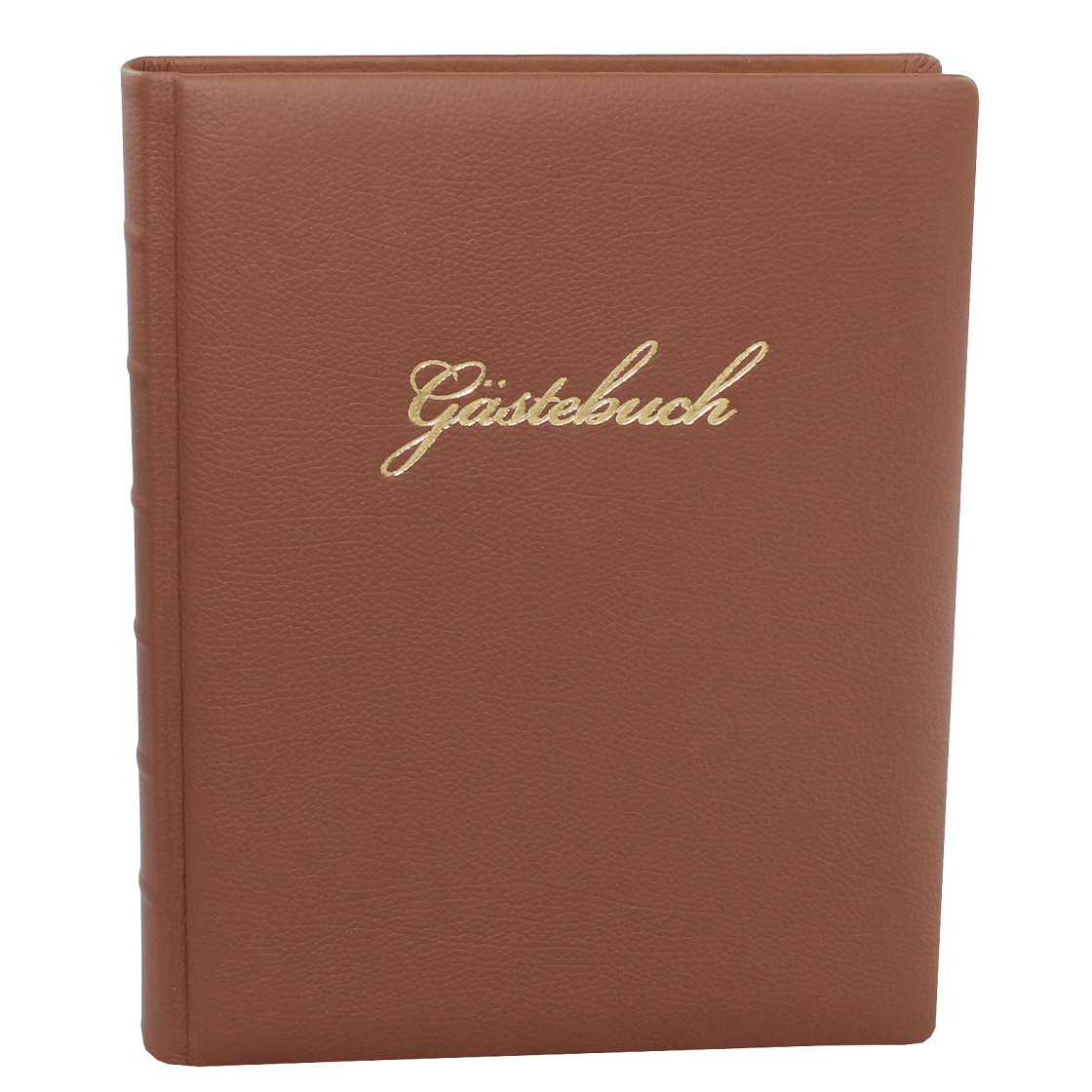 Qualitätsmerkmale des Gästebuchs aus genarbtem Leder in Braun mit Goldschnittblock