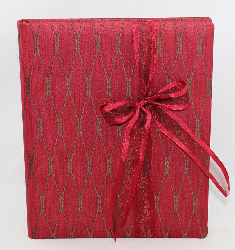 Das Erscheinungsbild des Gästebuches wird durch den edlen roten Mailänder Stoff in Rauten Optik geprägt. Eine farblich passende Schleife rundet das Erscheinungsbild perfekt ab.