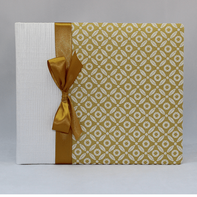 Das Erscheinungsbild des Gästebuches wird durch die Kombination eines weißen und goldfarbenem Stoffes geprägt. Jeder Stoff für sich ist schon etwas ganz besonderes. Der weiße Stoff mit seiner feinen Bambussstruktur deckt den Buchrücken und 1/3 der Buchvorderseite ab. Der goldfarbene Stoff mit seinenfeinen weißen Stickereien deckt 2/3 der Buchvorderseite ab. Eine farblich passende Satinschleife in einem gold-gelb Ton, schafft einen passenden Übergang beider Stoffe und rundet das Erscheinungsbild perfekt ab.