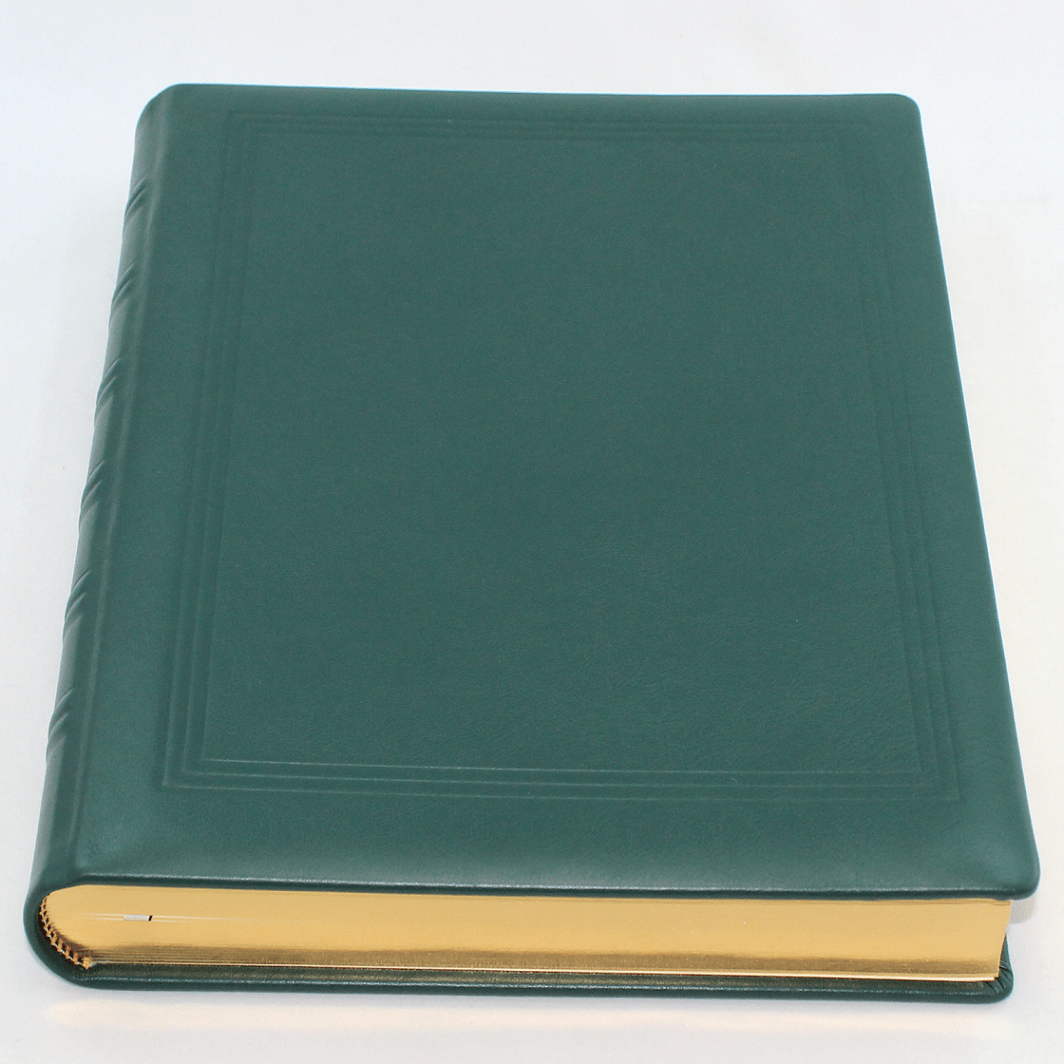Qualitätsmerkmale des Gästebuchs aus glattem Leder in Grün mit Goldschnittblock