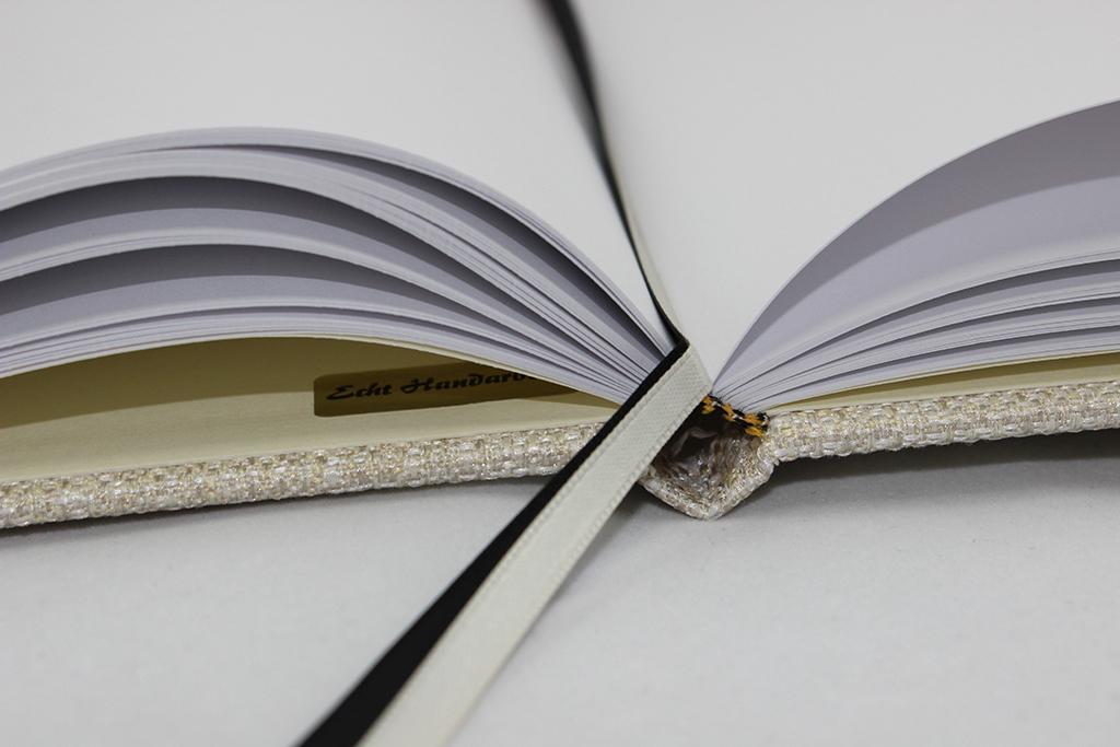 Damit das Gästebuch Las Vegas seine besonders weiche Haptik erhält, wird der Stoffeinband in Softcover hergestellt. Ein weiteres besonderes Merkmal reiner Handarbeit ist der von Hand eingeschlagene Einband.