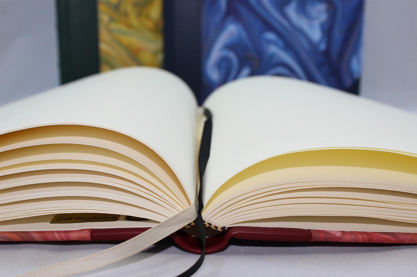 Um den typischen Buch-Charakter zu erreichen, wird der Blockrücken gerundet und mit den klassischen Buchbünden versehen. Zusätzlich wird der Buchblock mit einem Kapitalband veredelt. Damit das Gästebuch seine besonders weiche Haptik erhält, wird der Ledereinband in Softcover hergestellt.