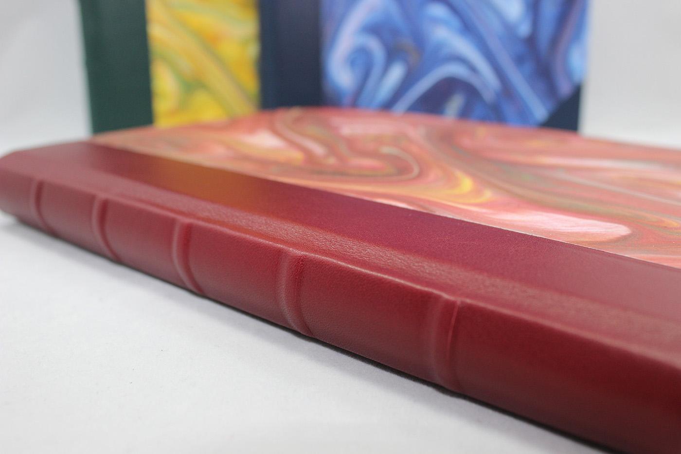 Bestes Fassgegerbtes (Vegan) Vollrindleder in den Farbtönen blau, bordeaux, grün und dazu farblich passende Marmorpapiere geben diesen Gästebüchern ihr besonderes Erscheinungsbild. Der Buchrücken und die Ecken sind mit Vollrindleder bezogen, wodurch auch der Ausdruck „Halbleder“ entsteht! Sie werden die Qualität spüren und den unverfälschlichen Ledergeruch lieben.