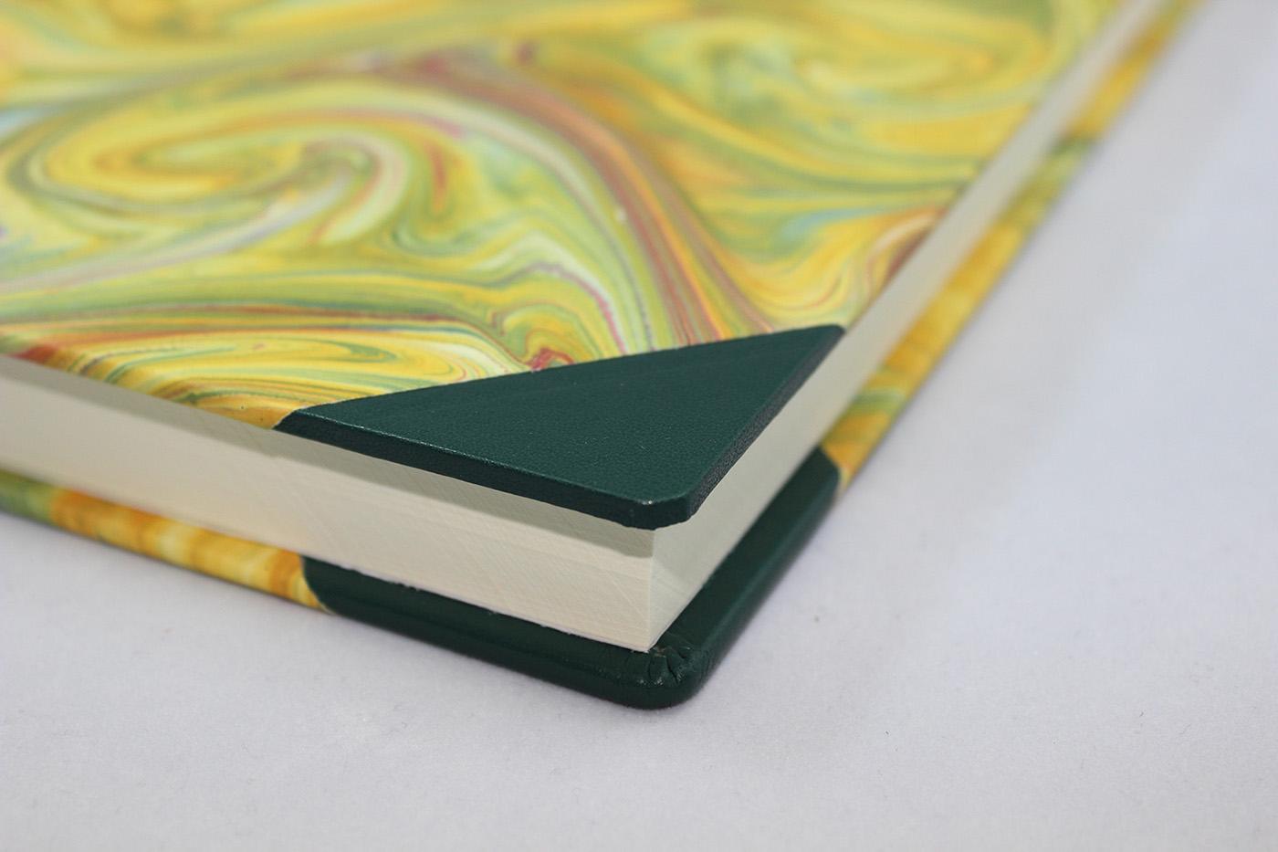 Ein weiteres besonderes Merkmal reiner Buchbinderischer Handarbeit sind die von Hand eingezogenen „runde Ecken“. In diesem Verfahren werden die Ecken mittels einer Ahle rund eingezogen. Maschinell ist dieses Verfahren nicht möglich, da zur Bearbeitung des Leders die Erfahrung und das Fingerspitzengefühl des Buchherstellers notwendig sind.