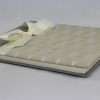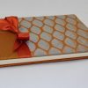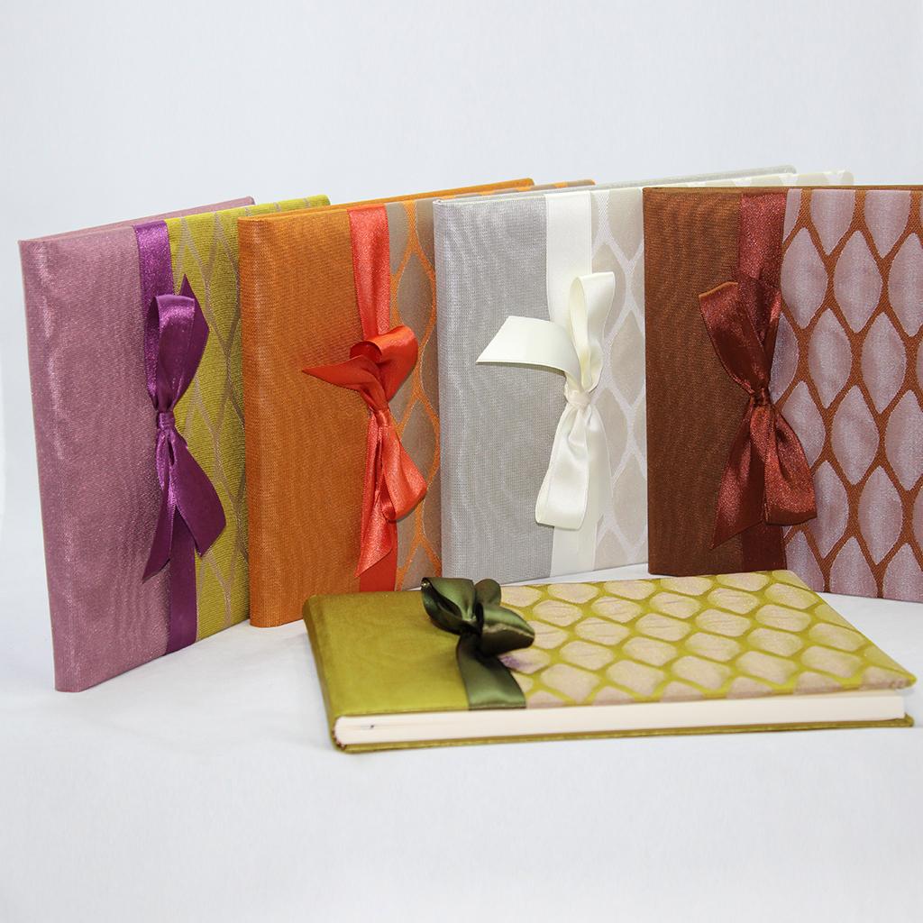 Das Gästebuch„Moire-Seide“, wird aus einer Kombination von Moire-Seide und feinstem doppelt gewebtem Seidenstoff in Rauten Optik kreiert. Eine elegante Satinschleife schmückt den Einband. Das Gästebuch ist in den Farbkombinationen Creme-weiß, Braun-lila, Orange-silber, Grün-kiwi und Lila-grün erhältlich. Die elegante Kombination der jeweils zwei Seidenstoffe macht dieses Gästebuch zum beliebten Begleiter für die Hochzeit, Taufe oder Kommunion.