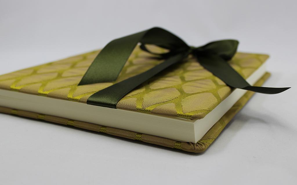 Damit das Gästebuch Moire seine besonders weiche Haptik erhält, wird der Stoffeinband in Softcover hergestellt. Ein weiteres besonderes Merkmal reiner Handarbeit sind die von Hand eingezogenen Einband.