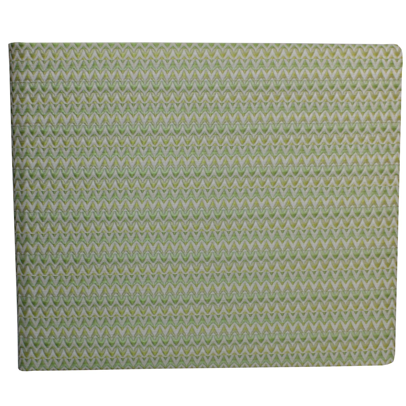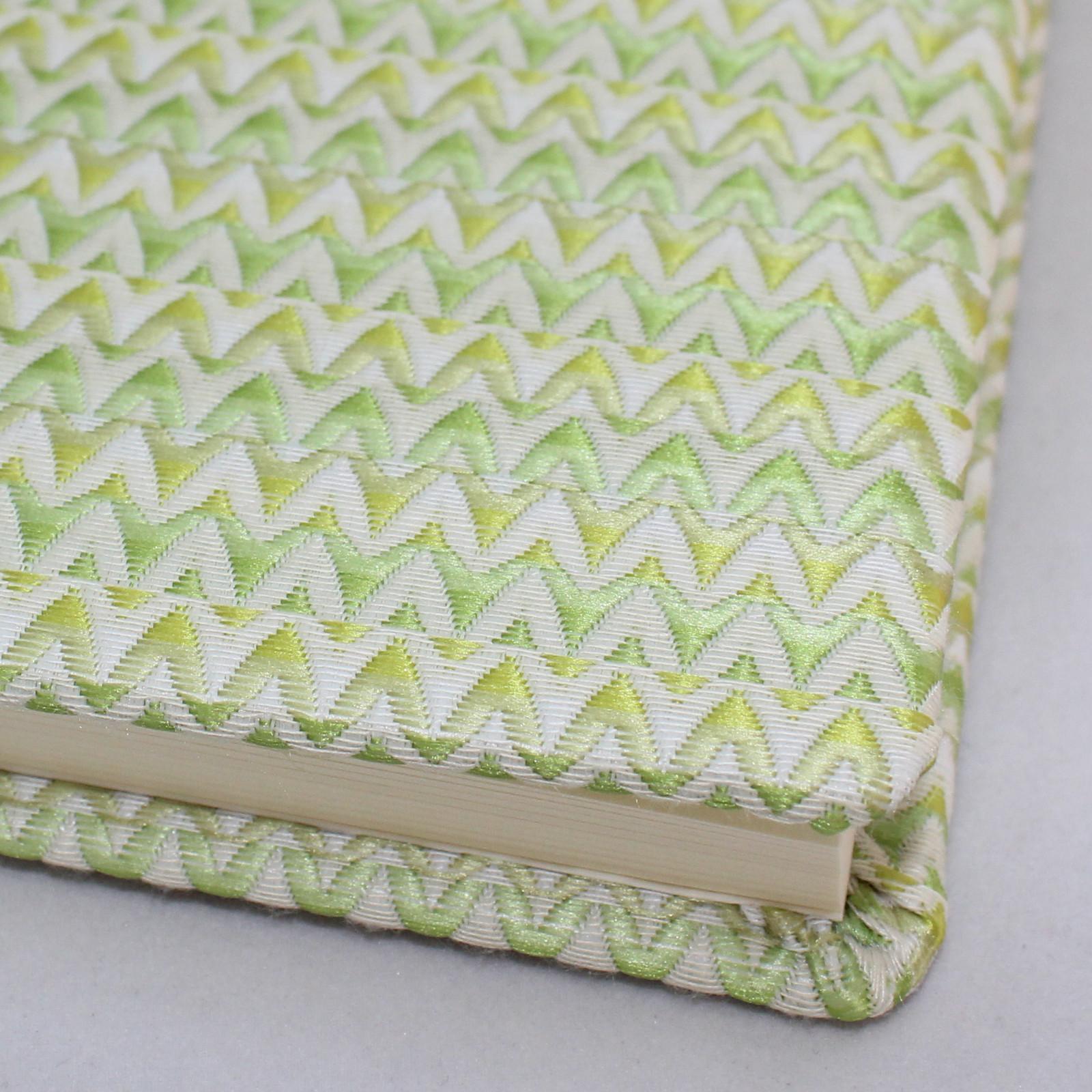 Das Erscheinungsbild des Gästebuches wird durch seinen aufwendig gewebten Baumwollstoff in strahlend grünem Wellenmuster geprägt.