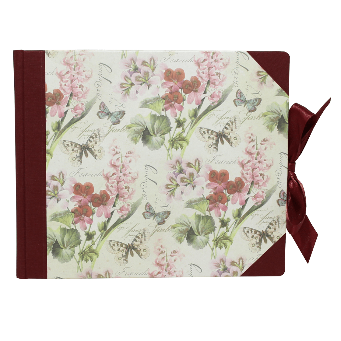 Der Einband ist aus echtem italienischen Designerpapier gefertigt. Zu sehen ist eine zarte Collage aus Blumen, Schmetterlingen und Handschriften auf elfenbeinfarbenem Papier. Dieses feminine Design führt Sie in einen viktorianischen Garten, der mit zarten rosa Blüten gefüllt ist. Goldpulverakzente verleihen einen zusätzlichen Hauch von Luxus. Der Buchrücken sowie die gegenüberliegenden Ecken sind mit einem Weinrotem Buchbinderleinen eingefasst. Das Gästebuch ist ein Einschreibebuch der Extraklasse für Ihre Hochzeitsgäste.